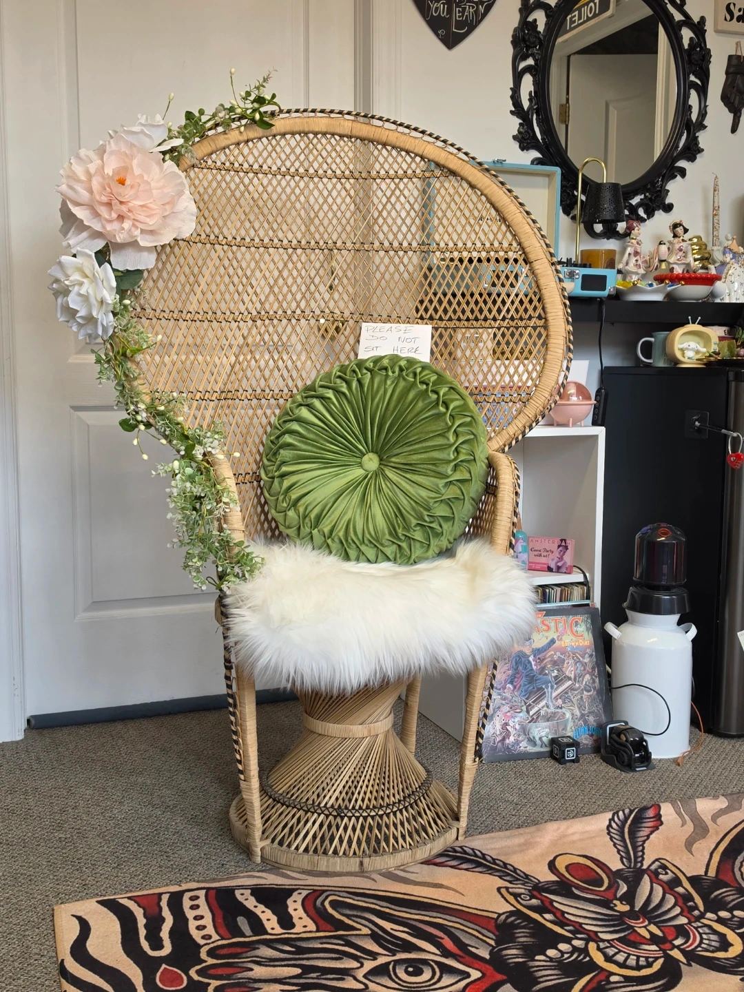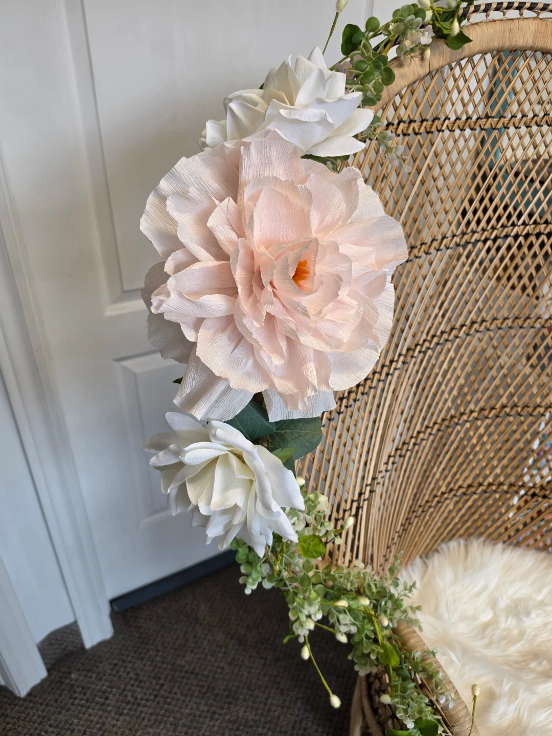 This wicker peacock chair features a decorative floral arrangement and a plush white cushion. It's perfect for adding a bohemian touch to any room. The chair is made of natural rattan material.The green pillow it is not included.