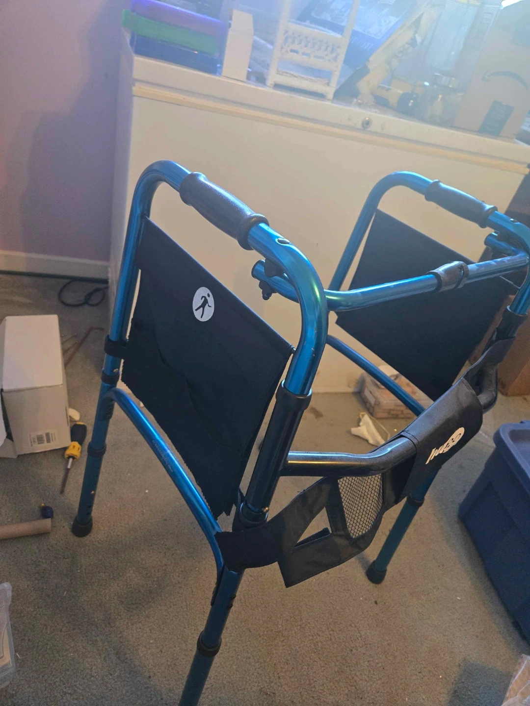 This is a Hugo brand folding walker in a bright blue colour. It features comfortable hand grips and a handy storage pouch. It's designed for easy portability and everyday use.