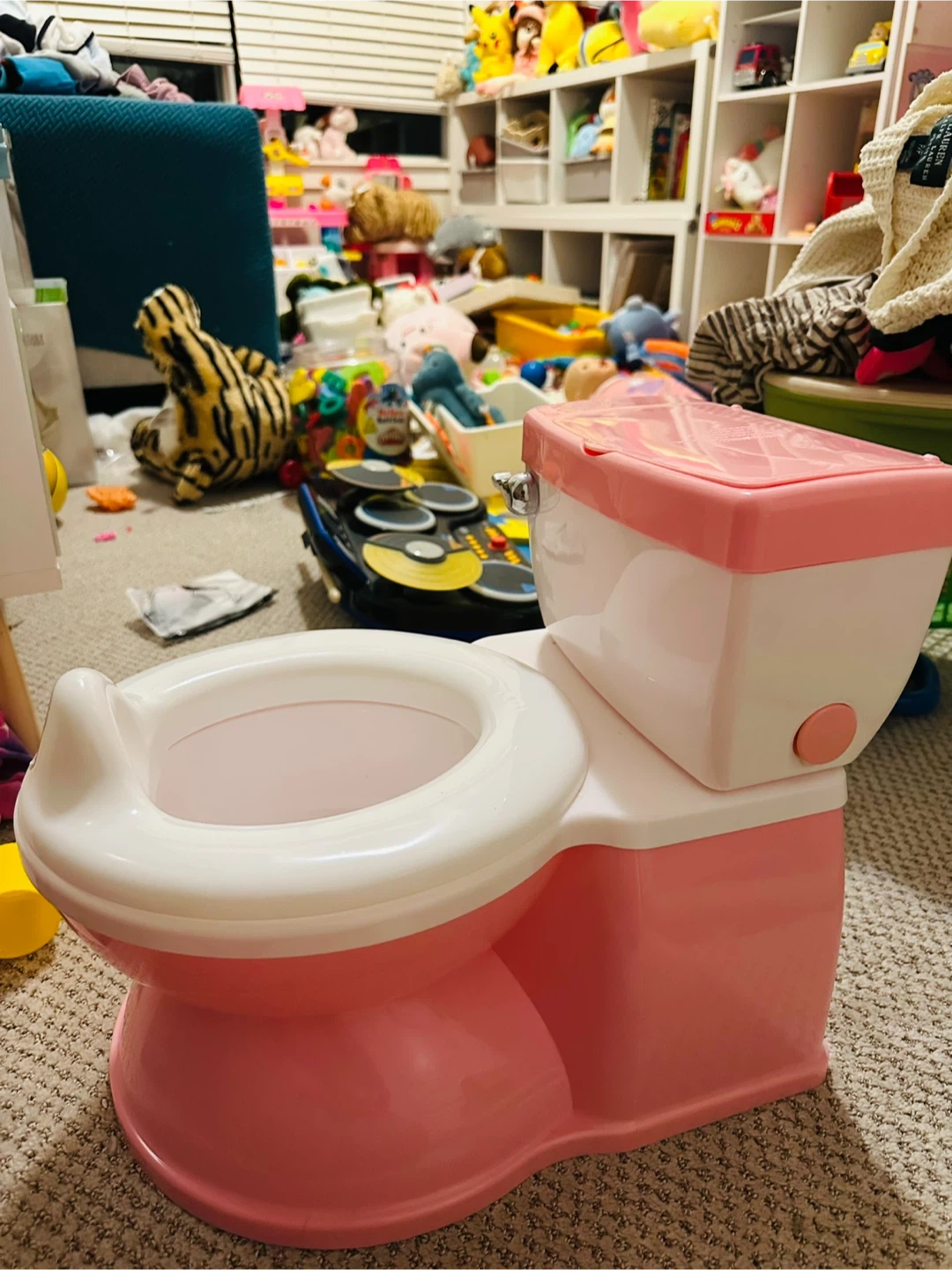 This is a cute pink and white training potty for little ones. It's designed to look like a real toilet. It's sturdy and easy to clean, perfect for starting out! It has flushing sound.