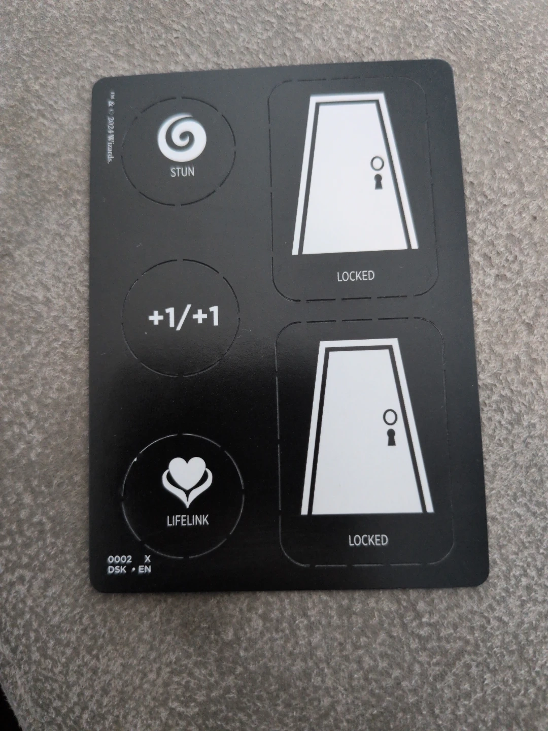 This listing is for a sheet of game tokens including STUN, +1/+1, LIFELINK, and LOCKED door icons. Copyright 2024 Wizards. These tokens are perfect for tabletop games that use status effects or game elements.