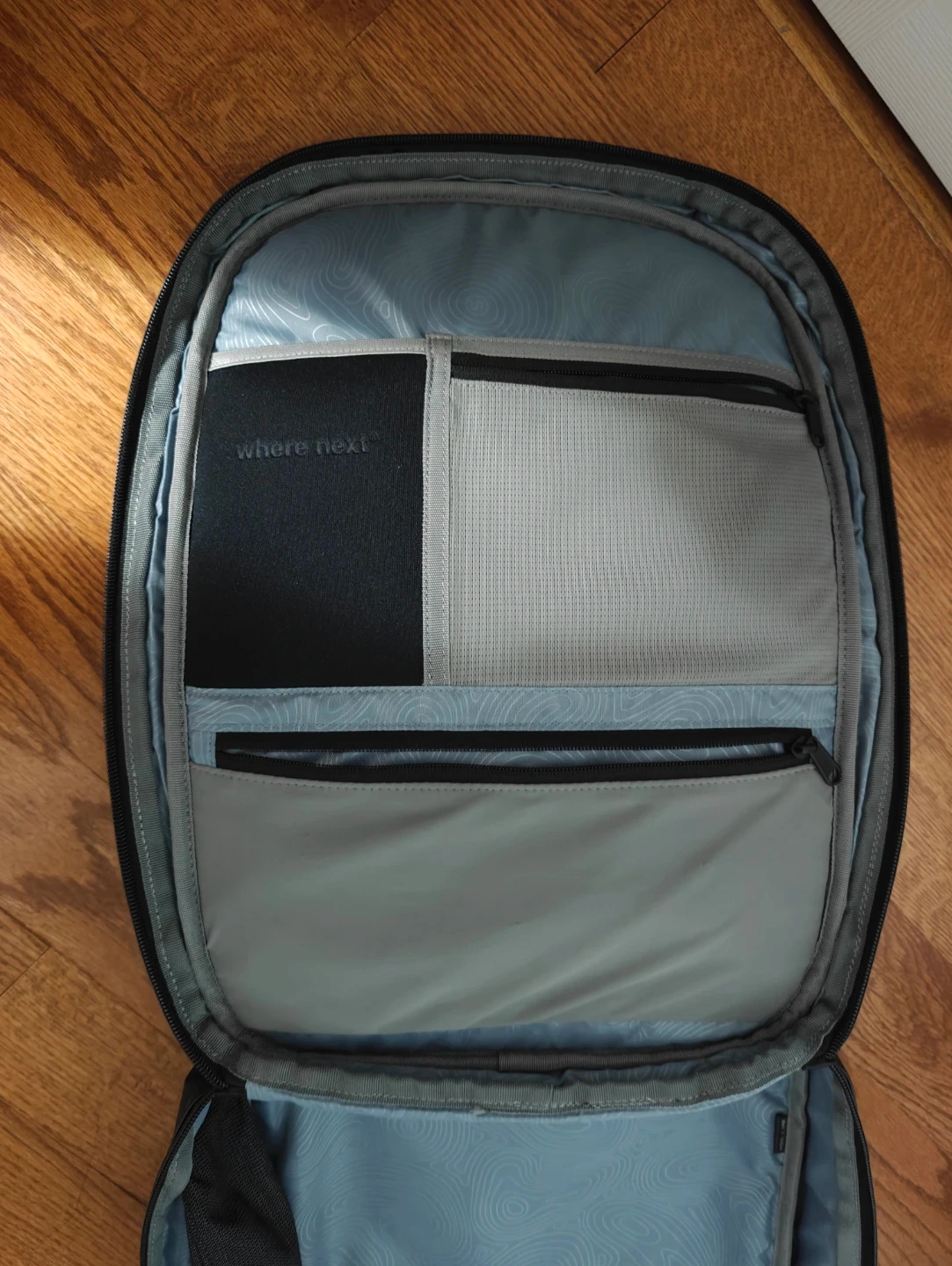 This is a black Sympl Studios Commuter Pack backpack. It features multiple interior pockets and organizational compartments. The backpack also includes its original storage bag. Super comfortable, can fit more than you think into the main compartment!