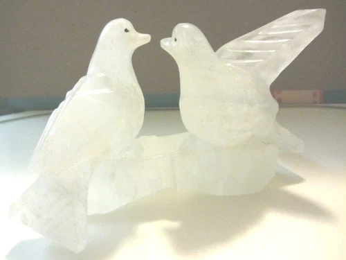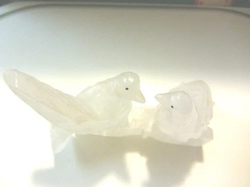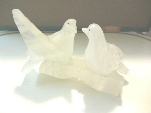 Pretty pair of frosted onyx bird sculptures facing each other, possibly representing love birds. The material is opaque/frosted, almost white, and glossy. Each sculpture measures approximately 5.5" wide by 3.5" high. This is a heavy item. The age, maker, and place of origin are unknown. It's a nice little mantle sculpture that can bring an atmosphere of tranquility and quaintness to your home. Feel free to message if you have any questions!