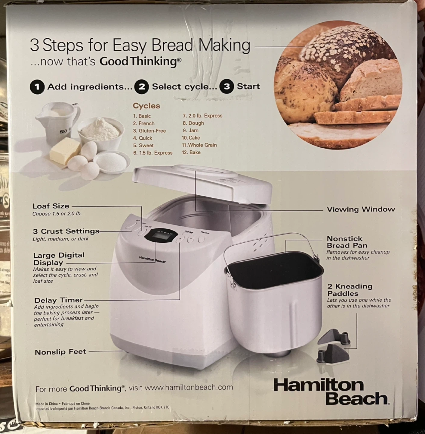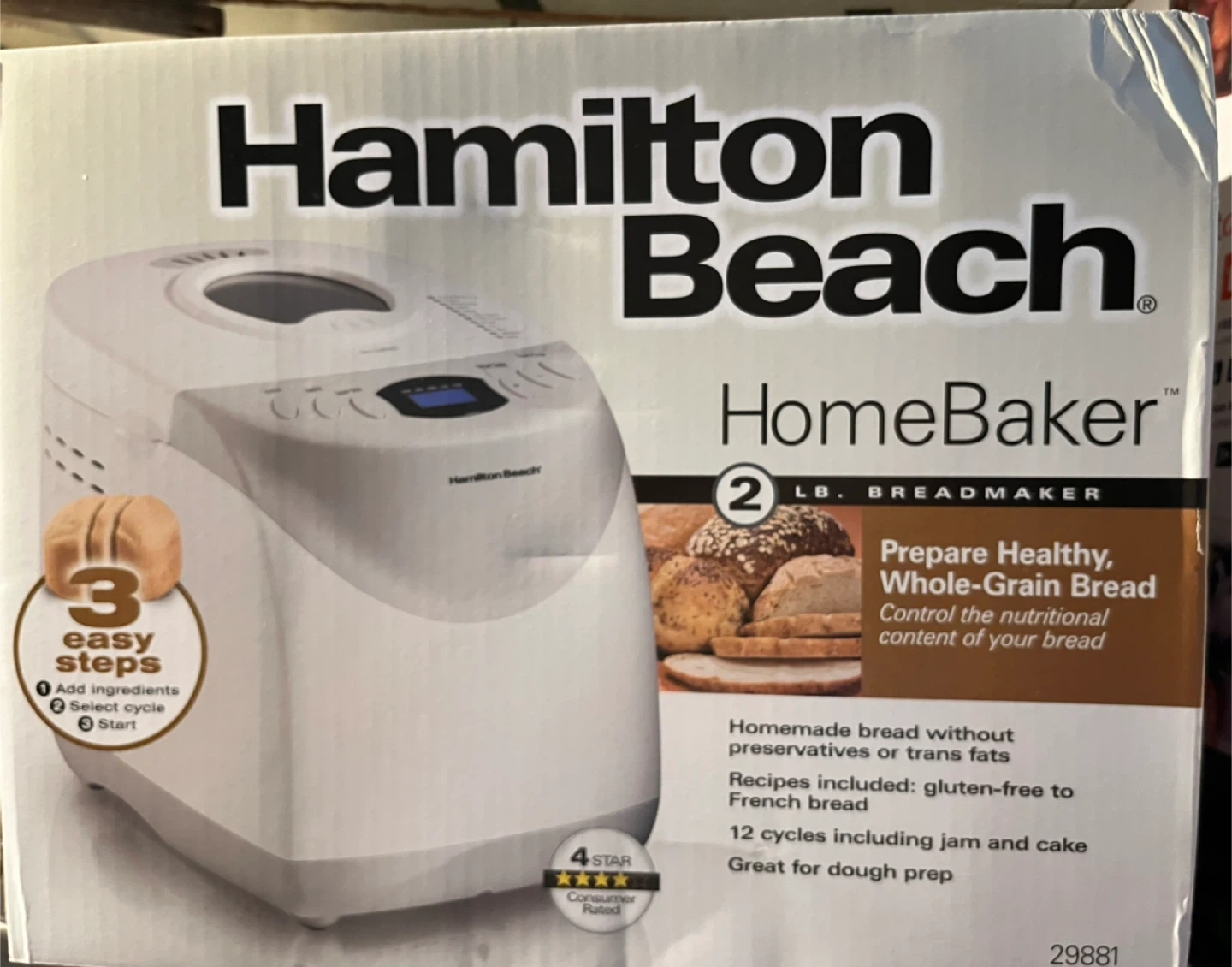 Moving sale: brand new in box Hamilton Beach HomeBaker bread maker for easy bread making! It features 3 easy steps: add ingredients, select cycle, and start. You can prepare healthy, whole-grain bread with it. It has 12 cycles including jam and cake, and is great for dough prep