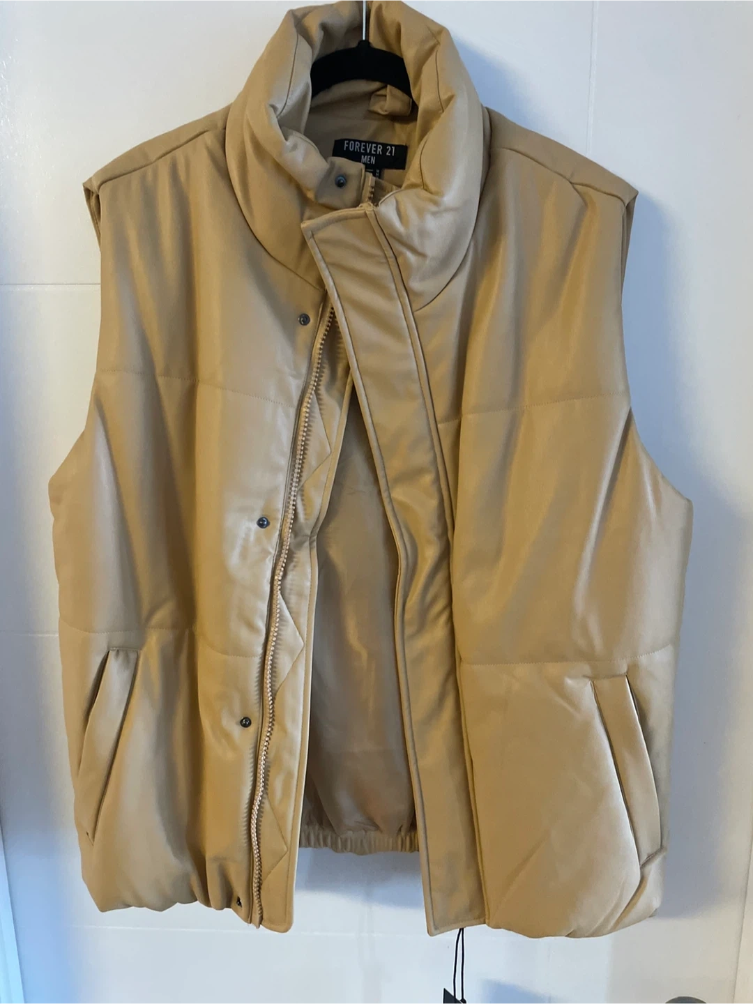 Gifting a Forever 21 Men's faux leather puffer vest in a neutral tan colour. It's a size medium and brand new. Perfect for layering!