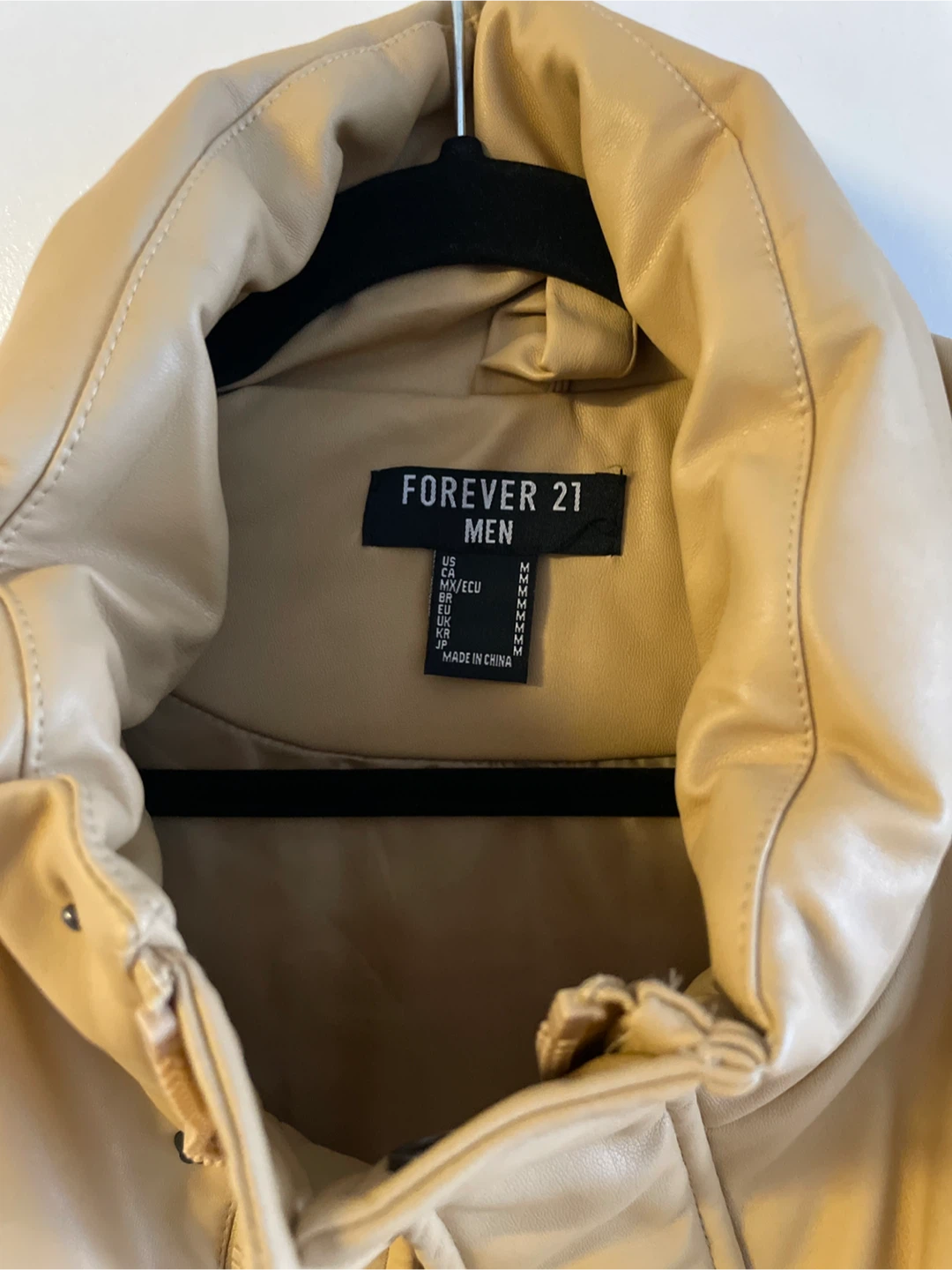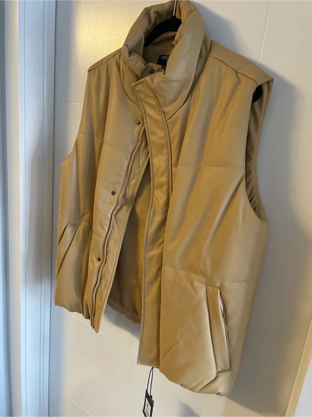 Gifting a Forever 21 Men's faux leather puffer vest in a neutral tan colour. It's a size medium and brand new. Perfect for layering!