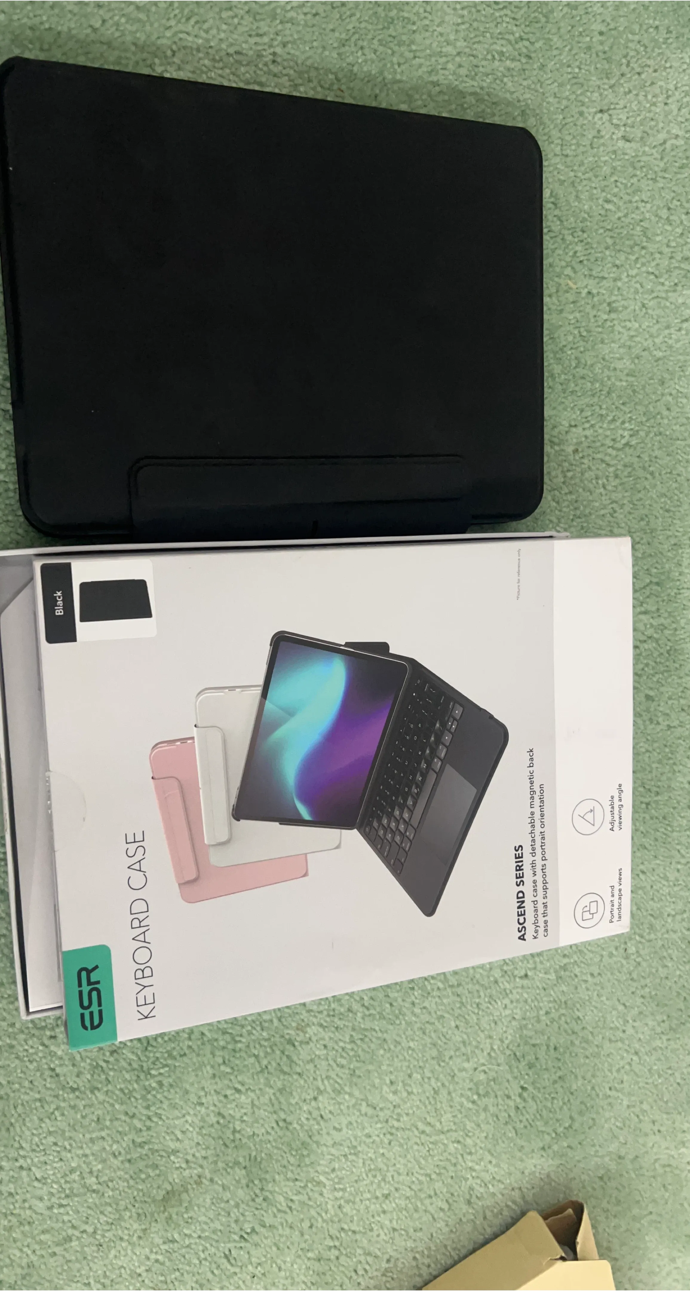 ESR Ascend Series keyboard case in black. It features a detachable magnetic back case that supports portrait orientation. Offers adjustable viewing angles for portrait and landscape use.