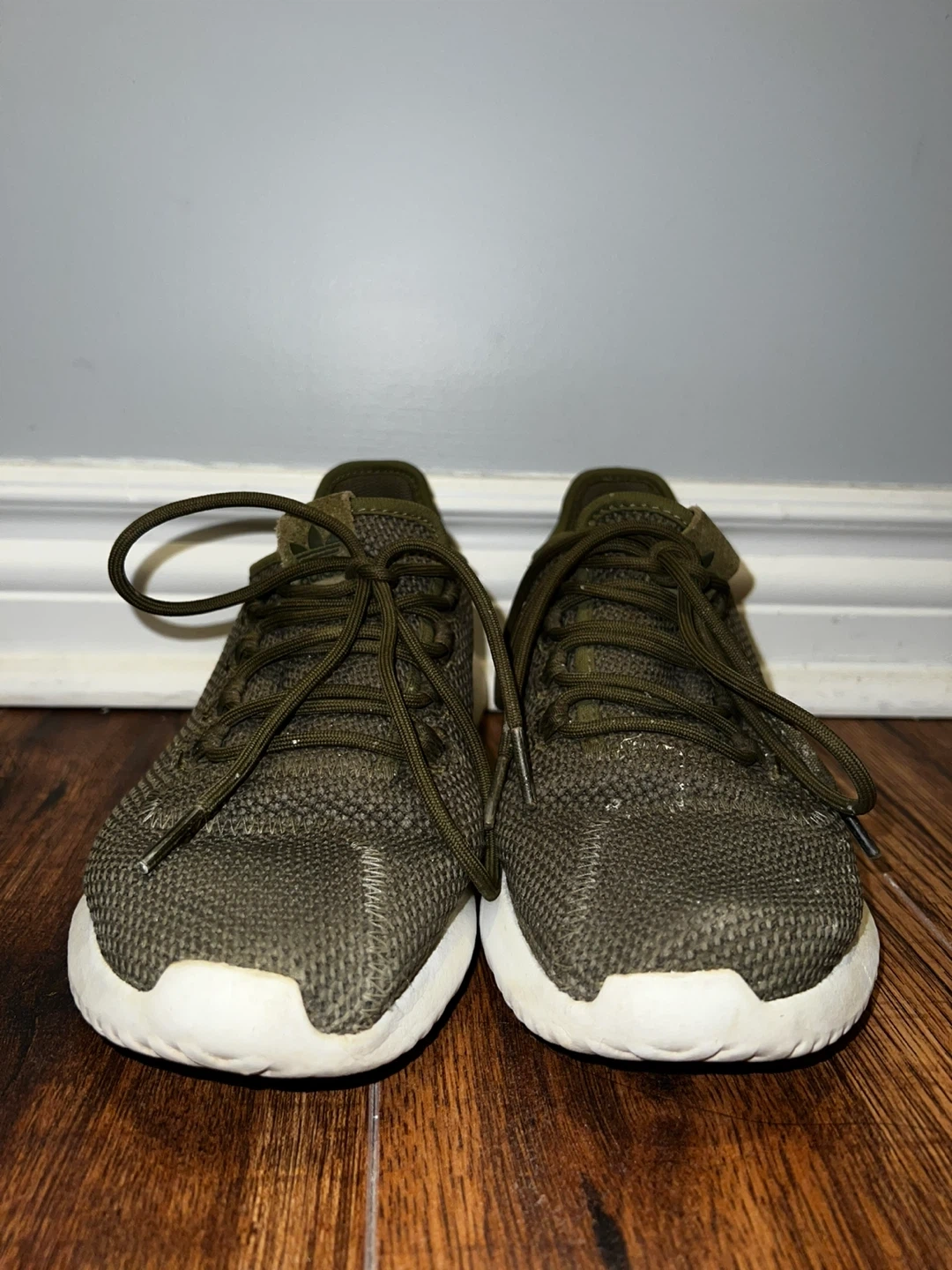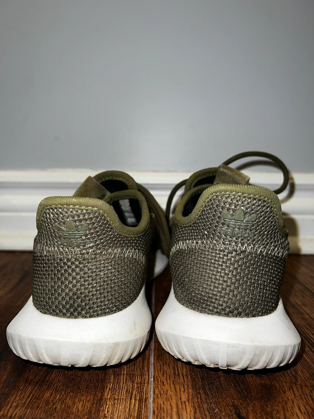 These Adidas Tubular Shadow sneakers are a stylish olive green colour. They feature a breathable mesh upper and a comfortable sole. Perfect for everyday wear!