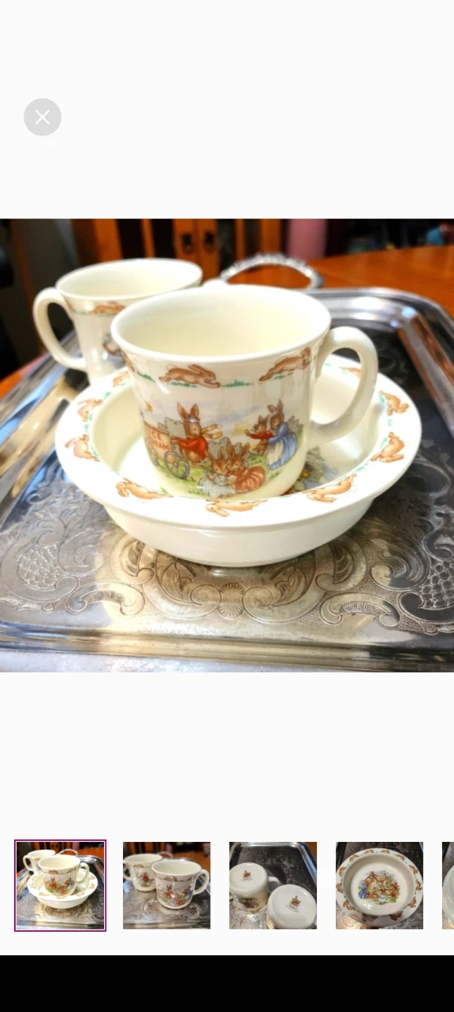 This is a Royal Doulton Bunnykins Golden Jubilee Celebration set. It includes a bowl and two mugs with adorable bunny designs. Perfect for collectors or anyone who loves a touch of whimsy! Vintage 1984.