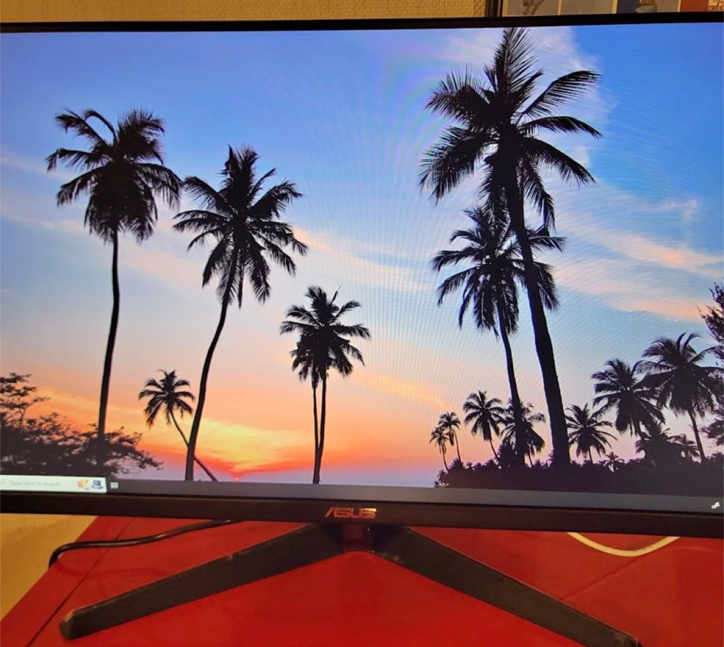 ASUS monitor with a beautiful tropical sunset wallpaper displayed. It has a sleek, modern design and a sturdy stand. Perfect for your workspace or gaming setup!
