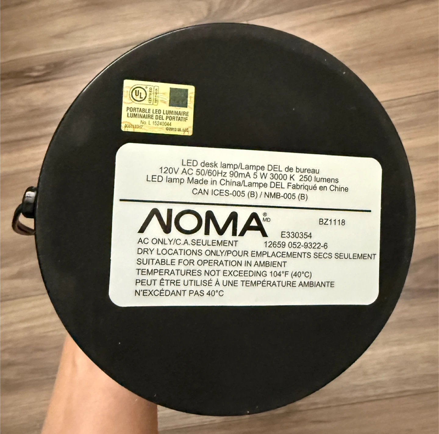 Selling a Noma LED desk lamp. It is black and in great condition. It's a great lamp for a desk or bedside table. It uses 120V AC 50/60Hz 90mA 5 W 3000 K 250 lumens. It is suitable for operation in ambient temperatures not exceeding 104°F (40°C)