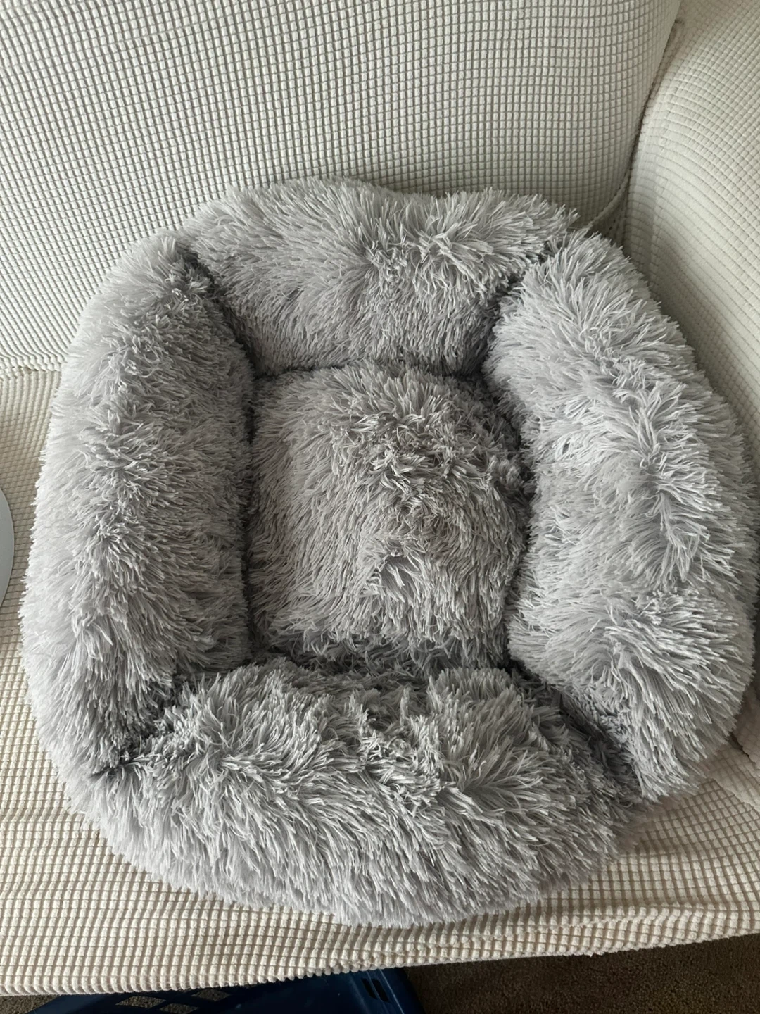 Super soft and comfy pet bed in grey. It's made with fluffy plush material for maximum coziness. Perfect for cats or small dogs to snuggle up in!
