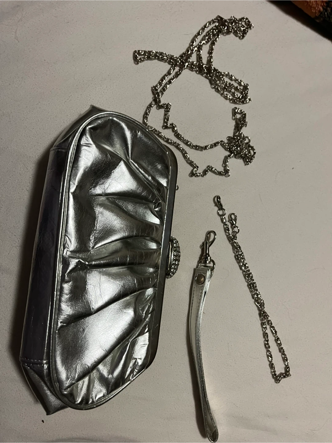 This is a shiny silver clutch purse. It comes with two detachable silver chain straps and a wrist strap. The front has a sparkling gem embellishment.