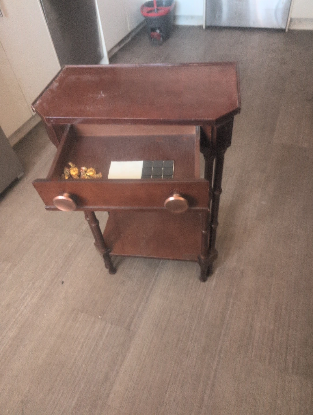 This is a dark wood accent table with a single drawer. It has decorative turned legs and a lower shelf for extra storage. The drawer hardware is copper-toned.