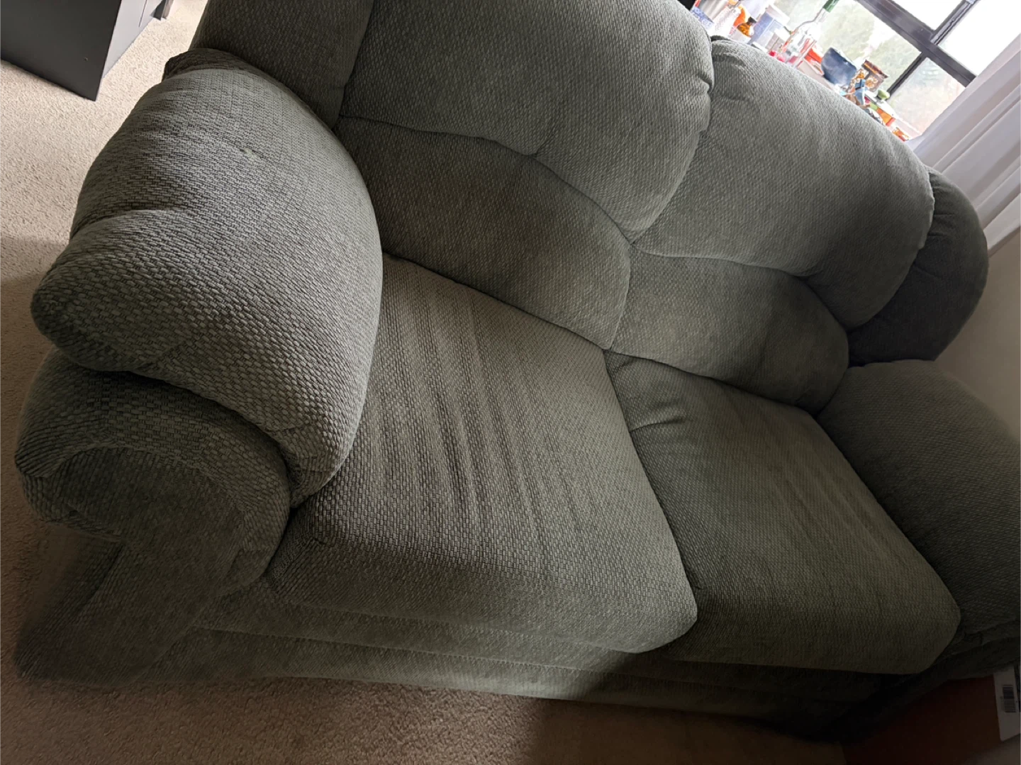 This is a comfy, two-seater loveseat sofa in a textured grey fabric. It has plush cushions and rolled arms. There's a small snag on the fabric, visible in the photos. It's a cozy spot for two people to relax!