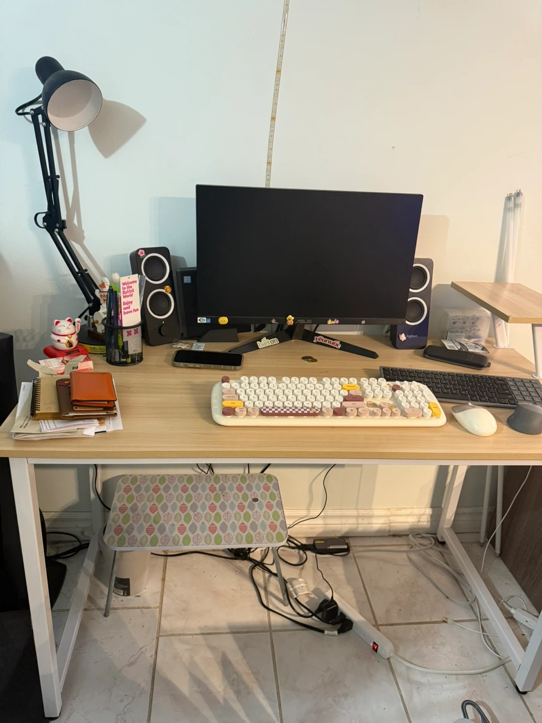 I'm selling a desk with some accessories. The desk has a light wood top and white legs. There's also a lamp, speakers, monitor on the desk. The desk is in great condition.