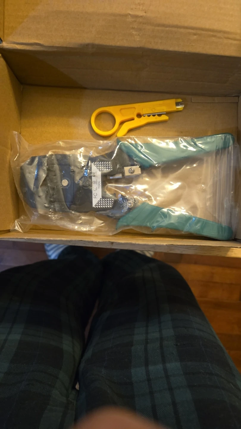 This set includes a crimping tool with teal handles and a yellow wire stripper. The crimping tool appears to be a multi-tool for electrical work. It's great for DIY electrical projects.