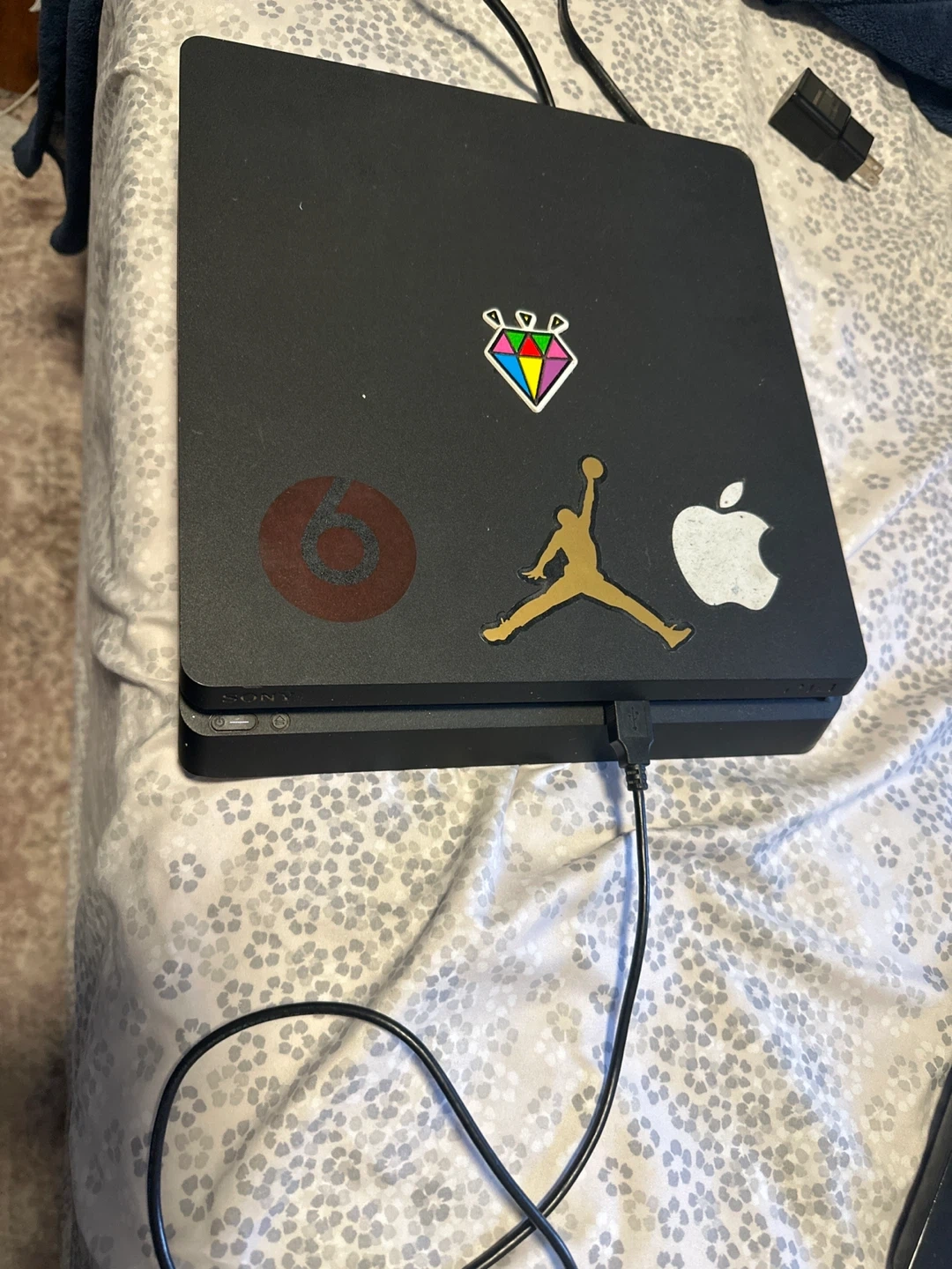 This is a Sony PlayStation 4 Slim console. It's black and comes with decorative stickers. The console includes necessary cables for operation.