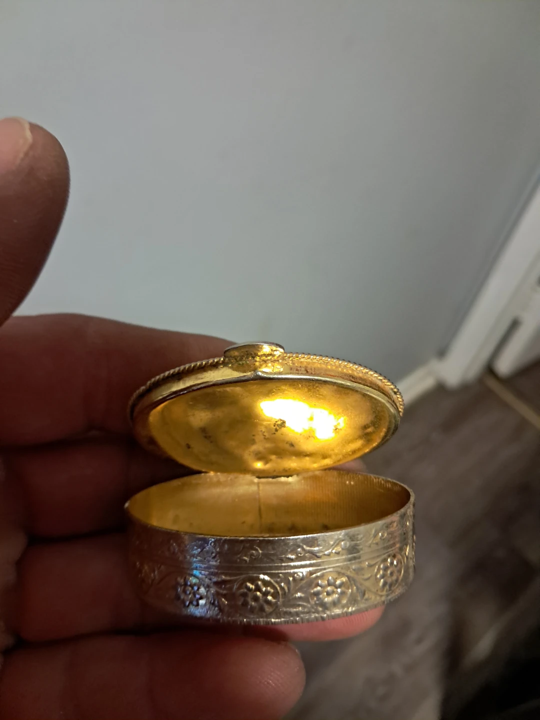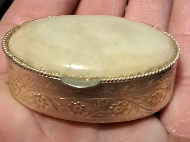 Selling a vintage pill box with a gold and silver design. It's in good condition and perfect for carrying small items or medications. The intricate floral pattern adds a touch of elegance to this functional piece
