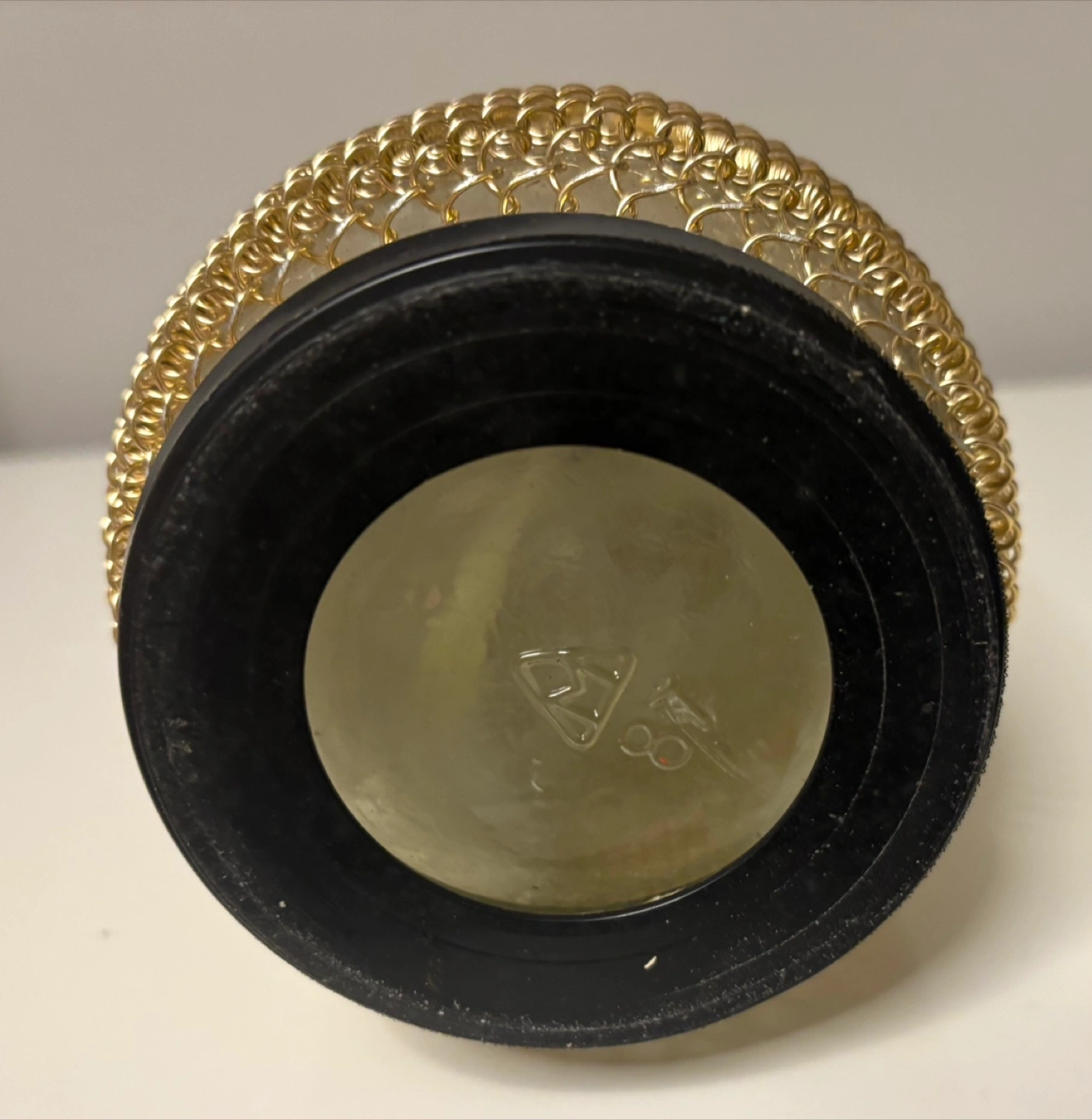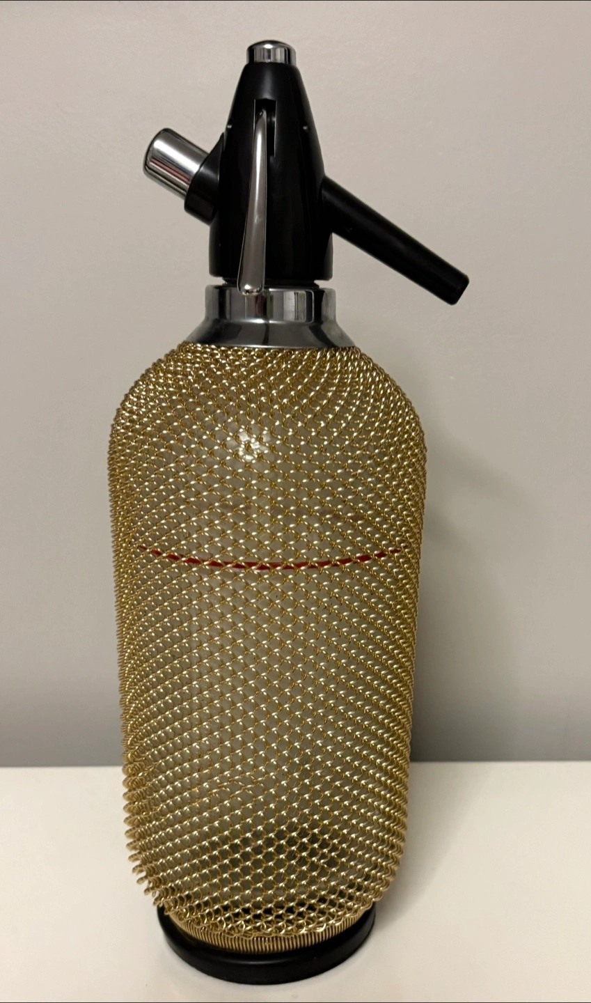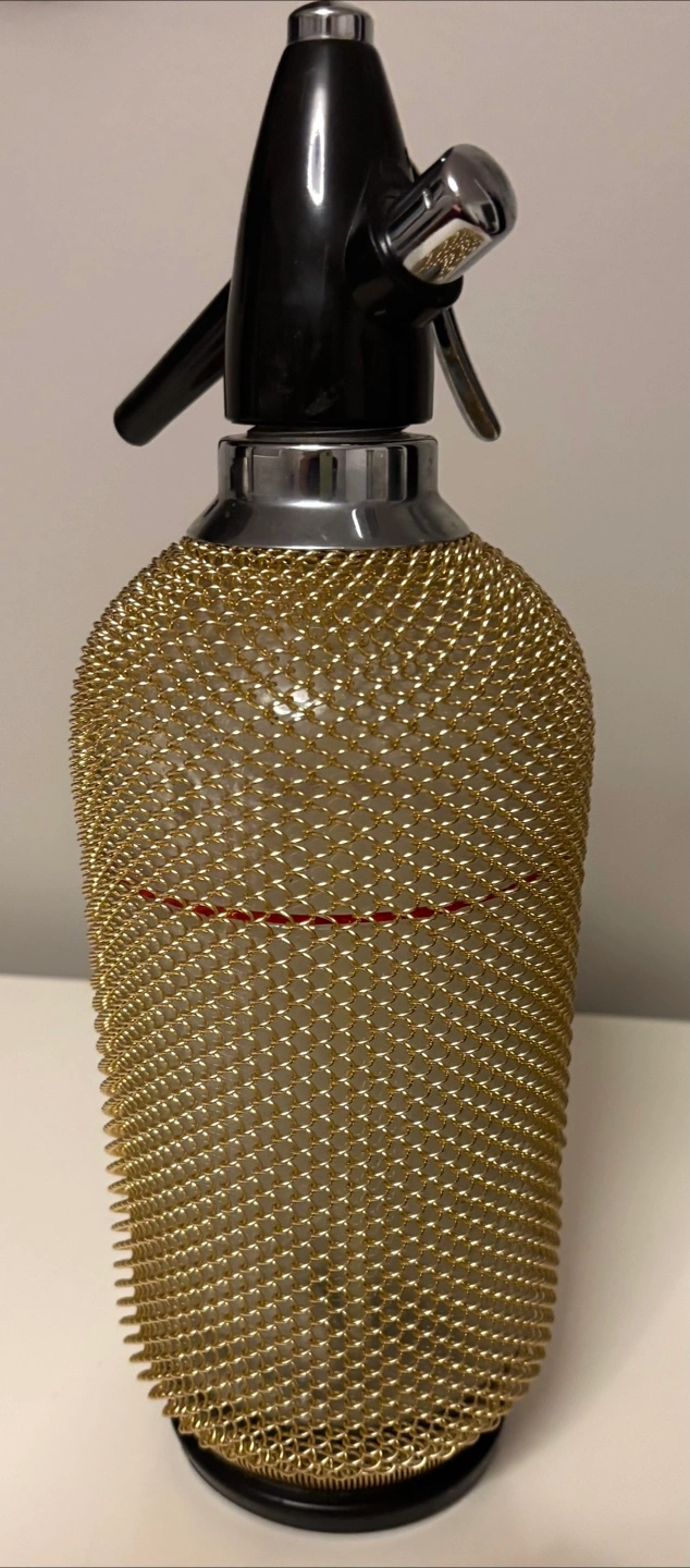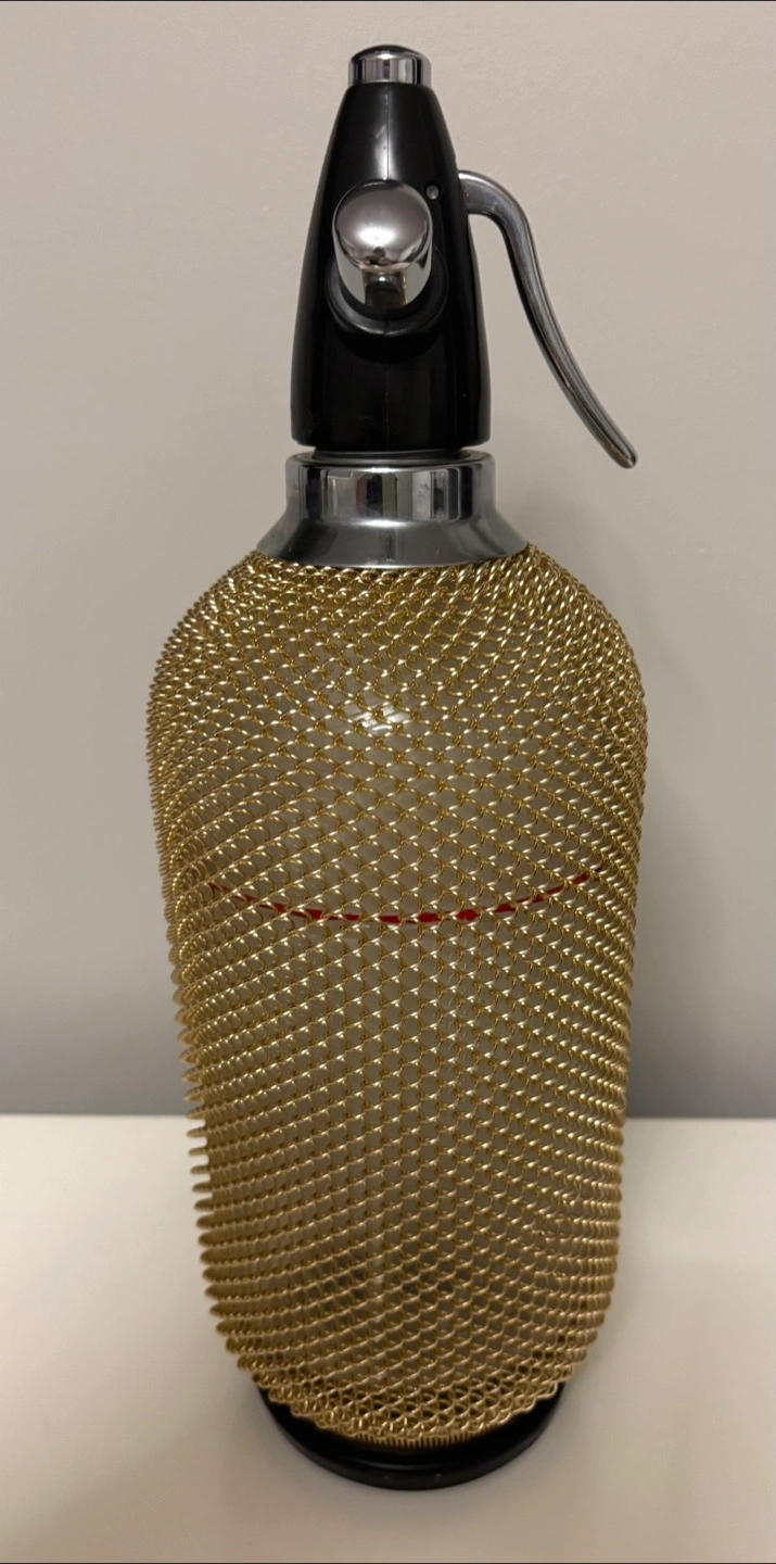 Vintage antique gold tone soda spritzer. Heavy glass with gold tone wire mesh cover, a great collector item.