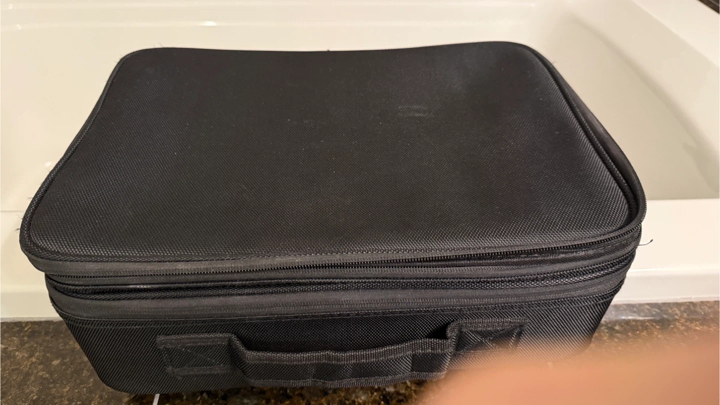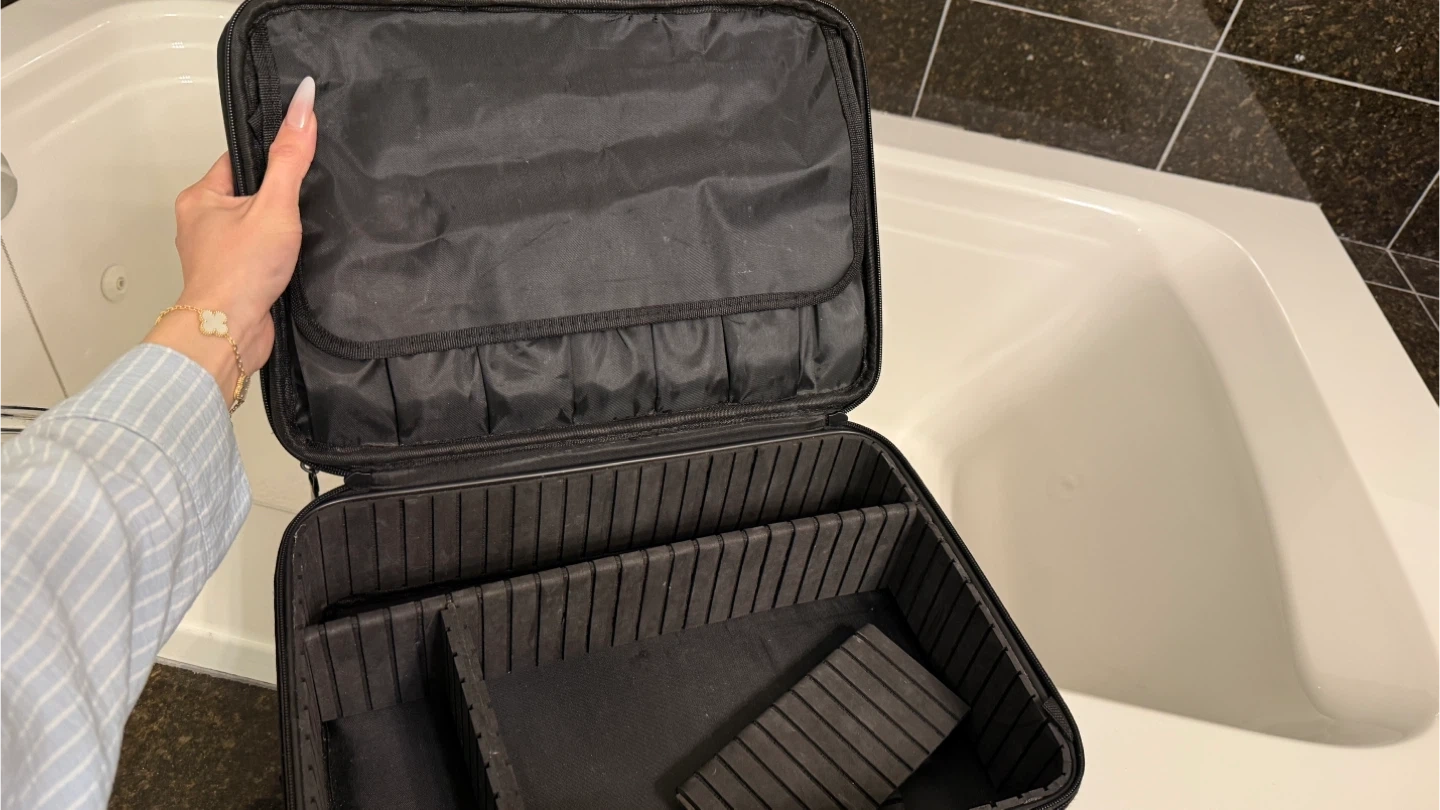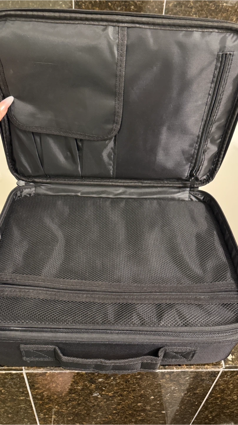 This black cosmetic train case is designed for organizing your makeup and beauty products. It features multiple compartments and dividers to keep items tidy. The case is made of durable fabric and includes a top handle for easy transport.