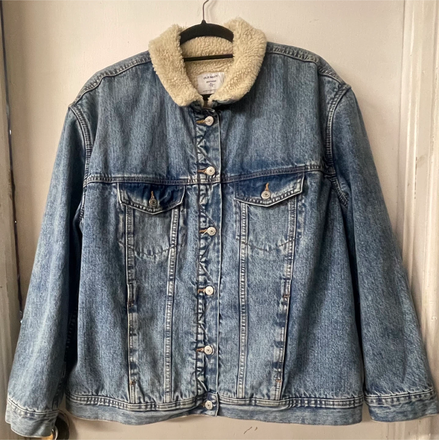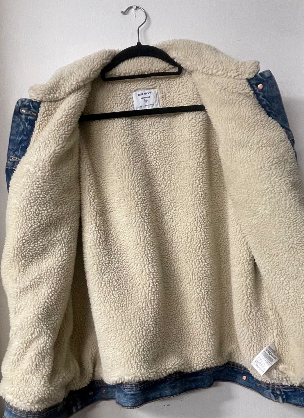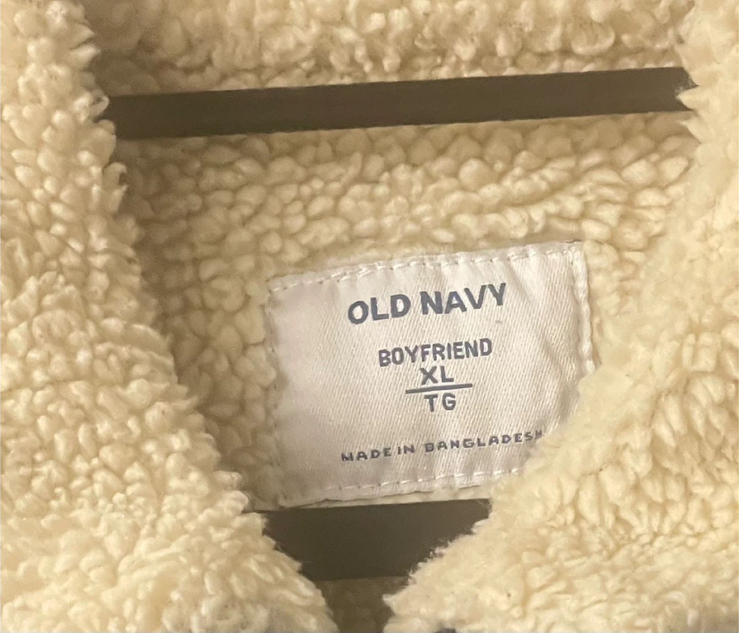 Item Details: Features a cozy sherpa lining and collar. Jacket has the classic boyfriend fit and size XL. Made in Bangladesh.