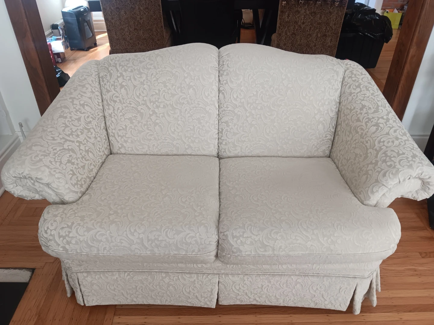 Cream loveseat with a damask pattern. It's upholstered in a textured fabric. This sofa is perfect for a smaller living space. It comes with a skirted base.