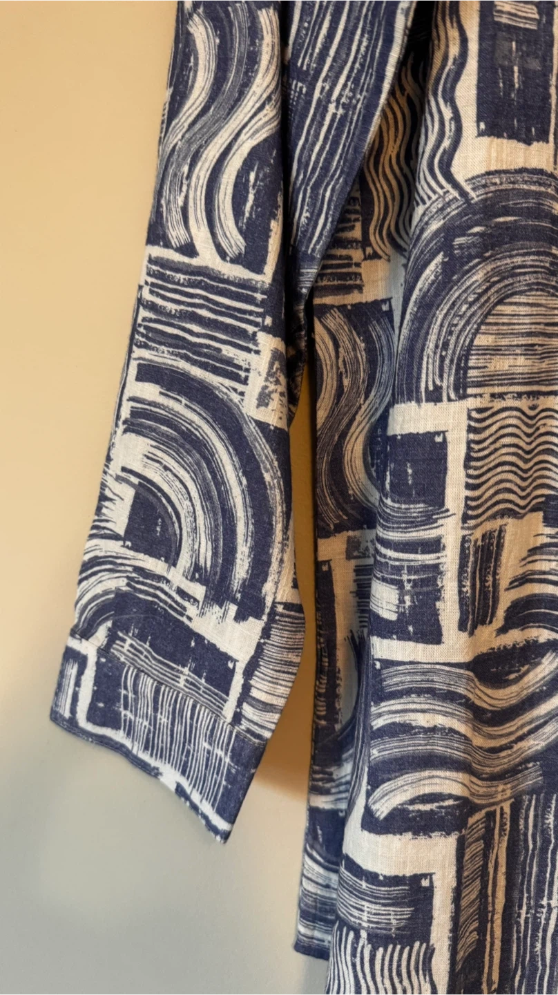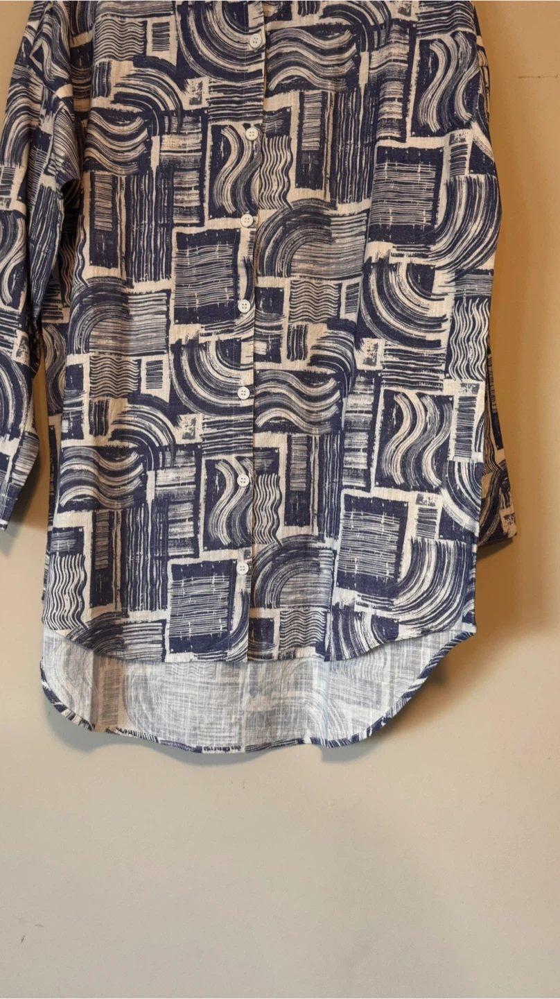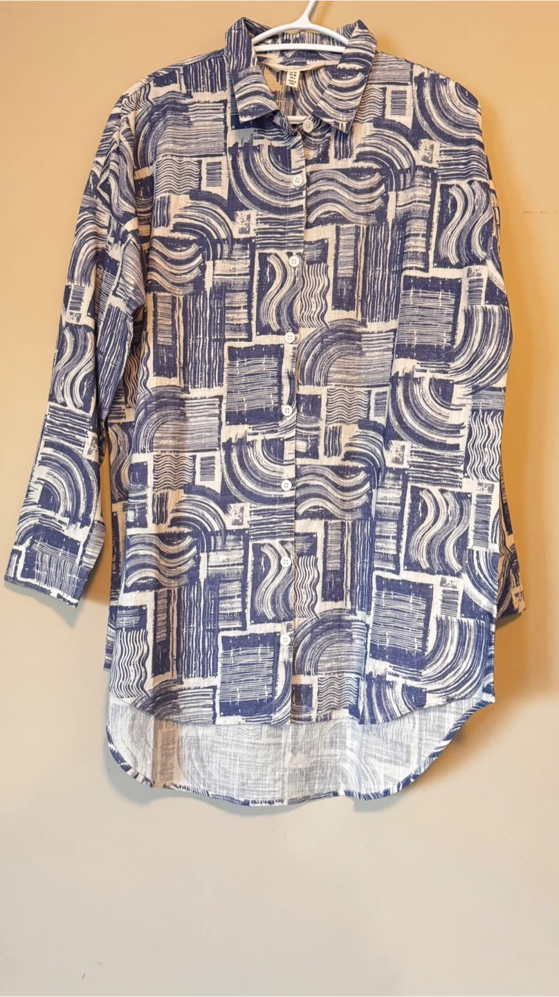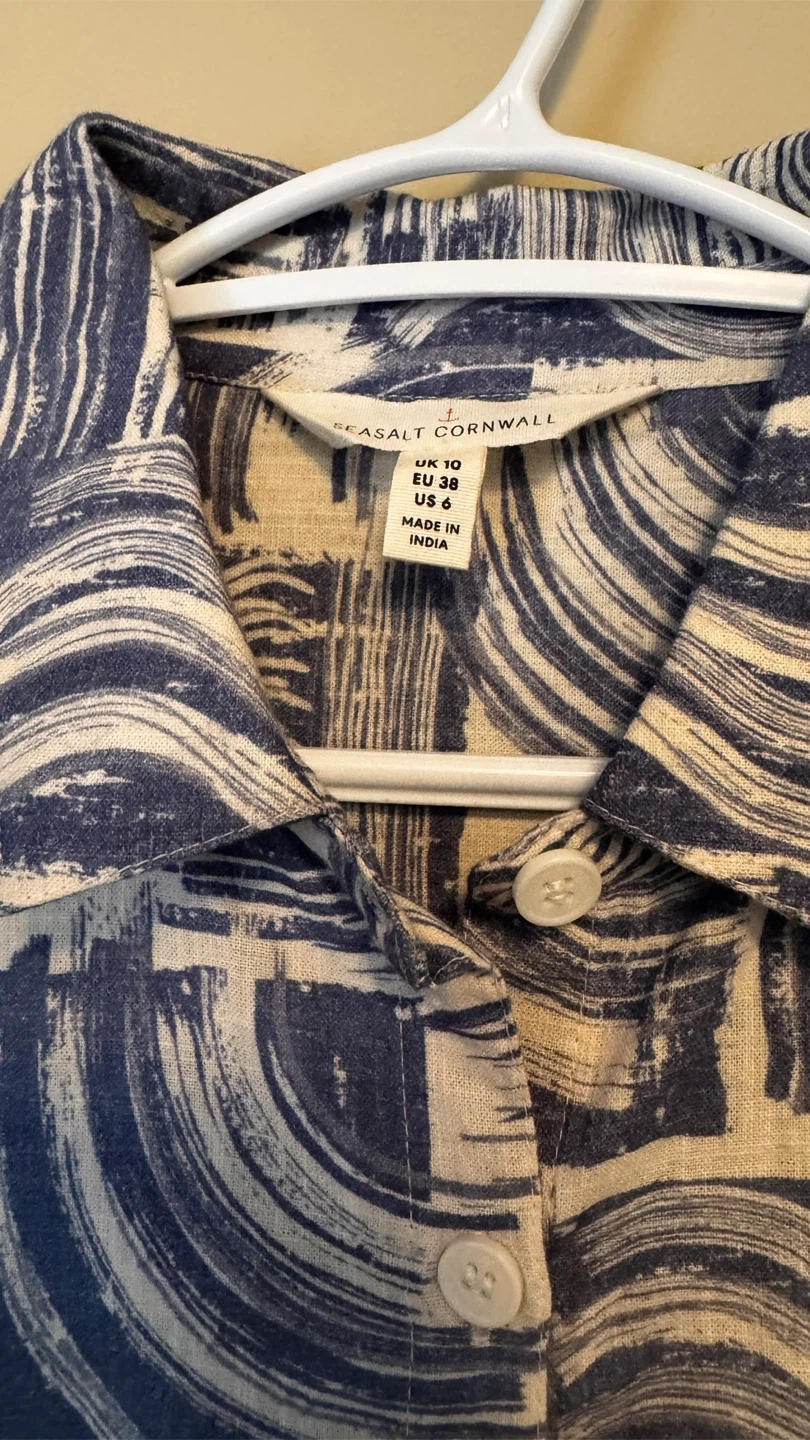 Here's a stylish button-down shirt from Seasalt Cornwall! It's a UK size 10, which is a US size 6. The shirt features a unique blue and white pattern that's sure to catch the eye. Perfect for adding a touch of flair to your wardrobe