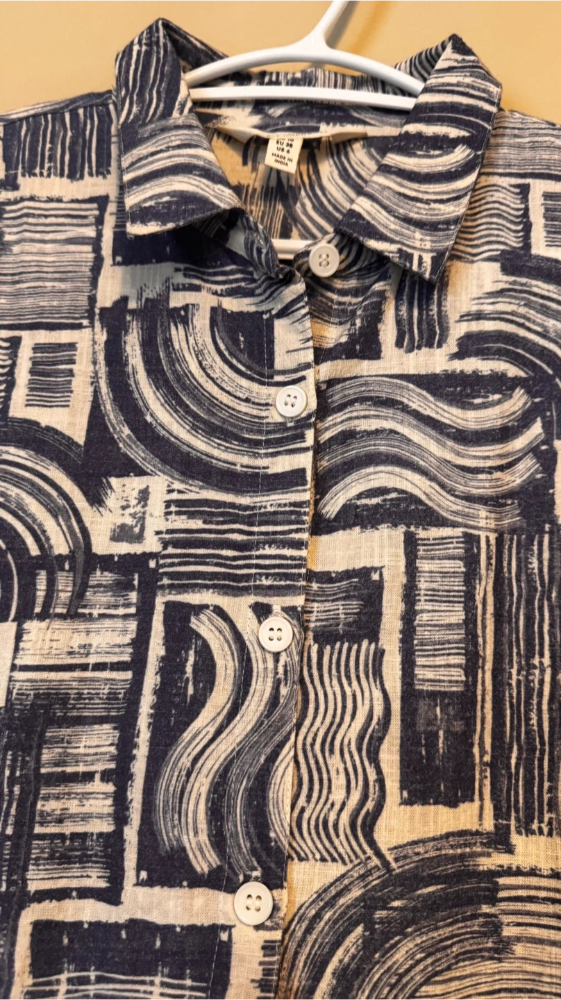 Here's a stylish button-down shirt from Seasalt Cornwall! It's a UK size 10, which is a US size 6. The shirt features a unique blue and white pattern that's sure to catch the eye. Perfect for adding a touch of flair to your wardrobe