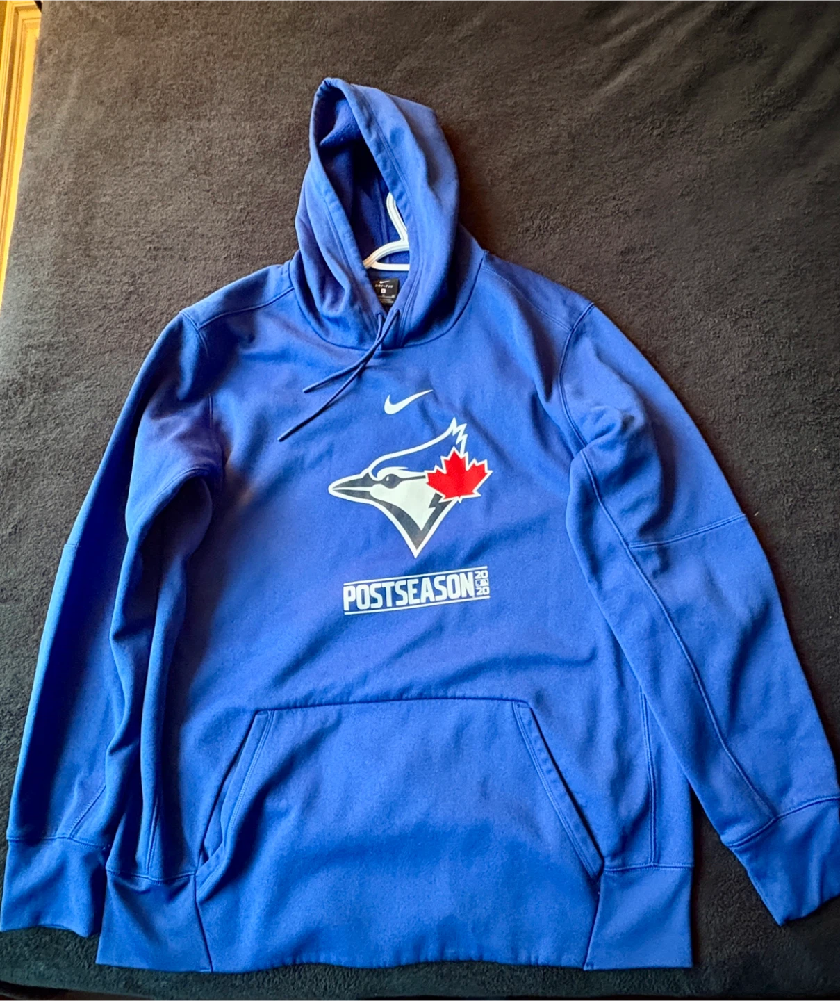 Selling a Nike Dri-FIT hoodie featuring the Toronto Blue Jays Postseason logo. It's a vibrant blue and in size XL. Perfect for showing your team spirit!