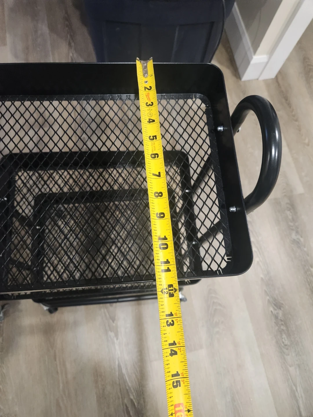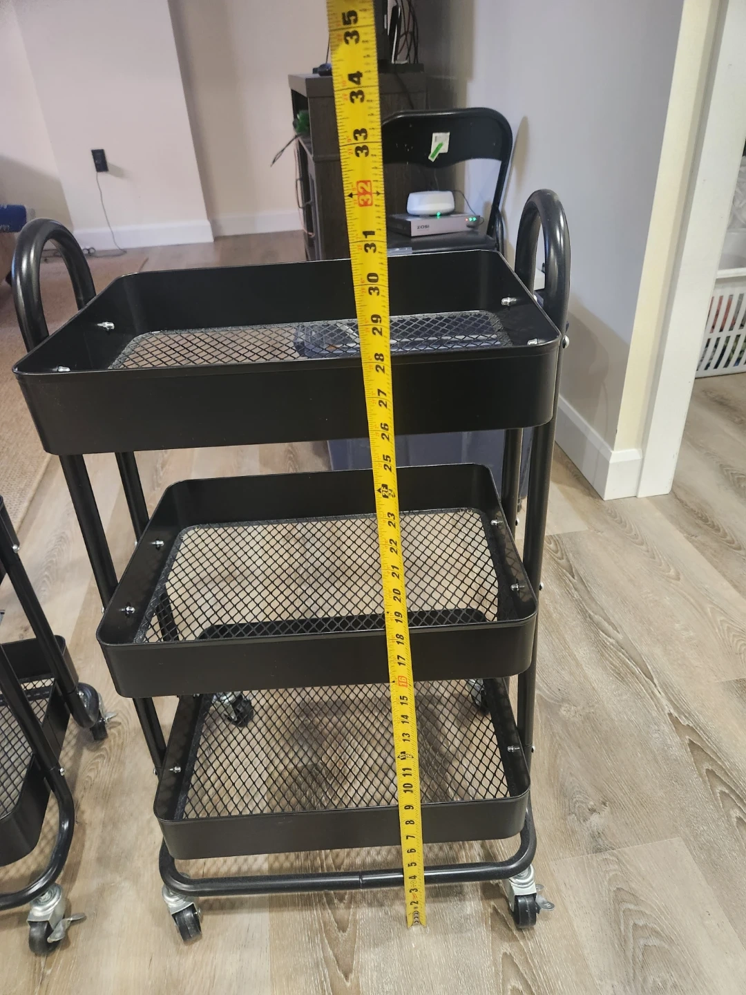 Black 3-tier rolling storage cart. It's made of metal with a mesh basket design. Measures approximately 35 inches in height.