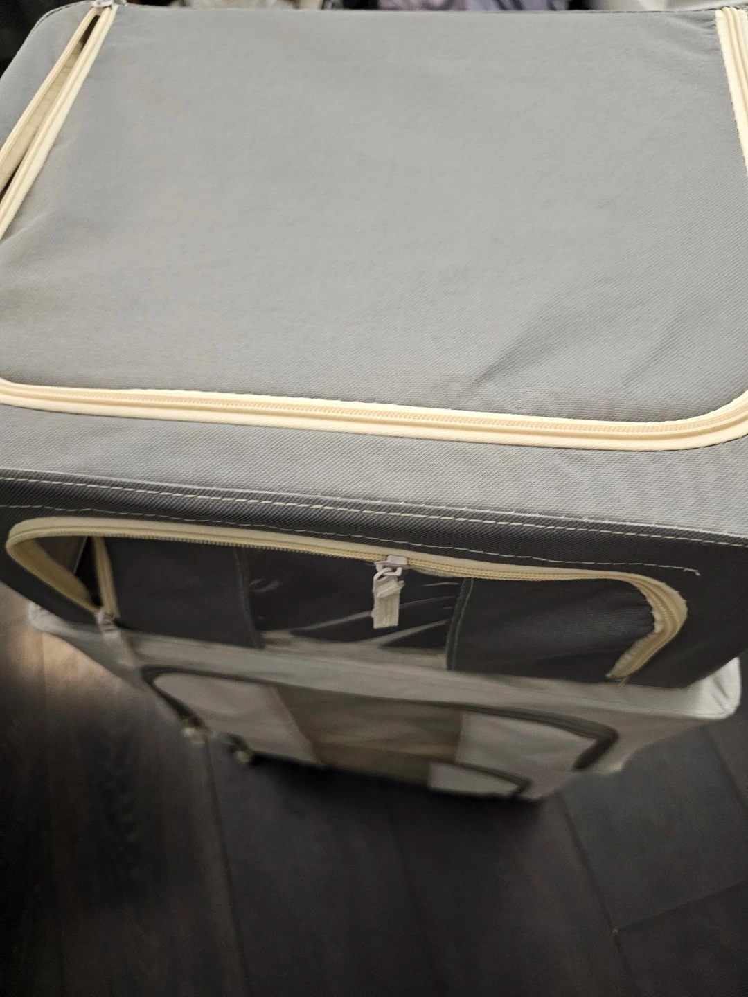 Set of three fabric storage boxes. Foldable and good size to put in your closet.