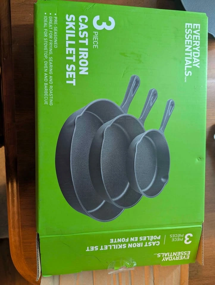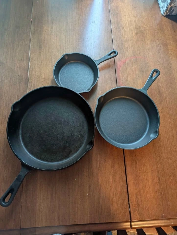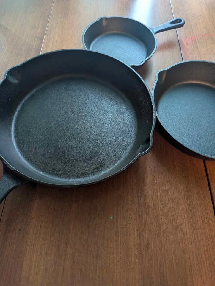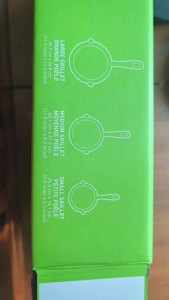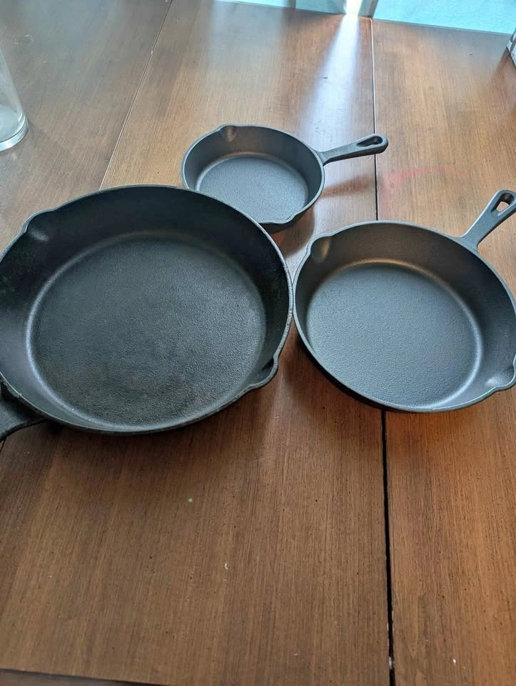 The largest skillet (36.5cm x 26.8cm) has been used and is seasoned, ready for cooking. The other skillets are new and have never been used. Pick up in Port Coquitlam.