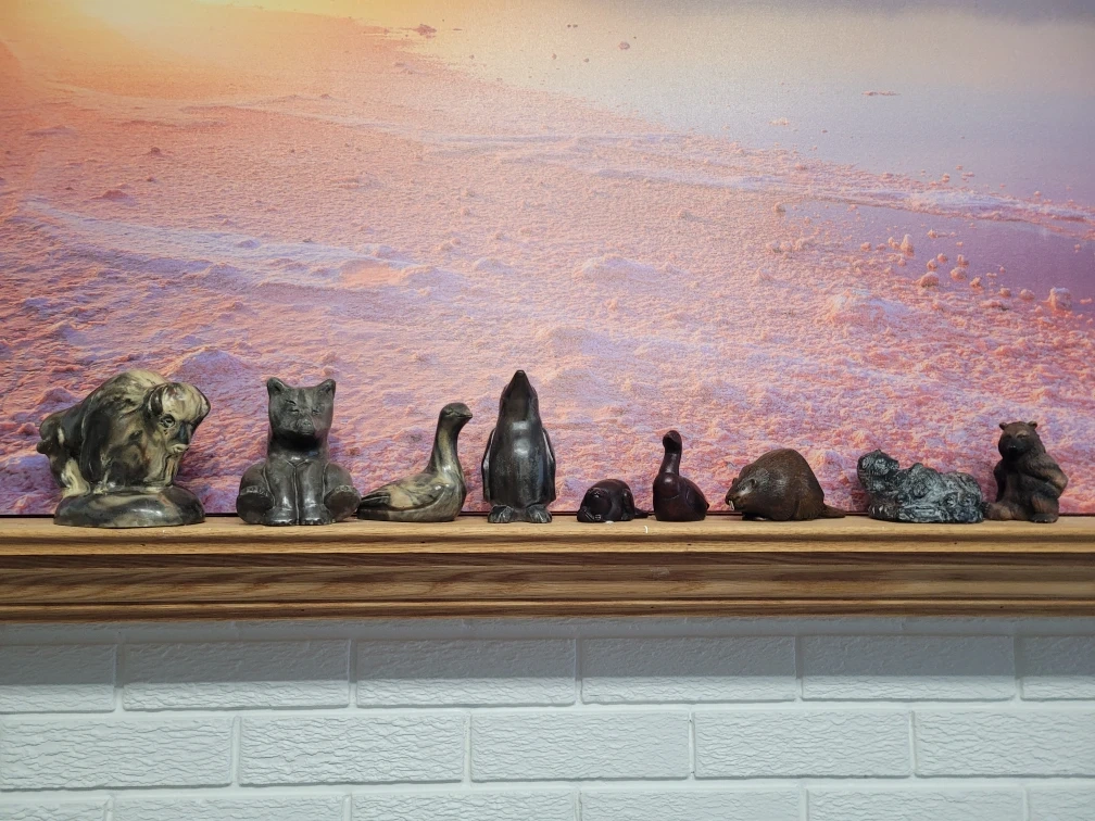 Here are some animal carvings. They look like they are made of stone or wood. There are multiple types of animals, including bears, beavers, turtles, and etc.