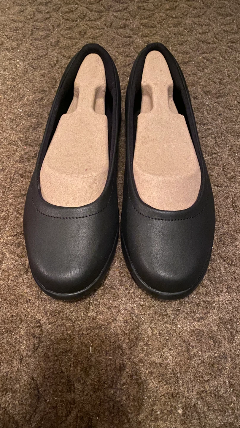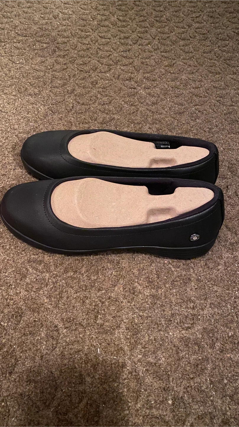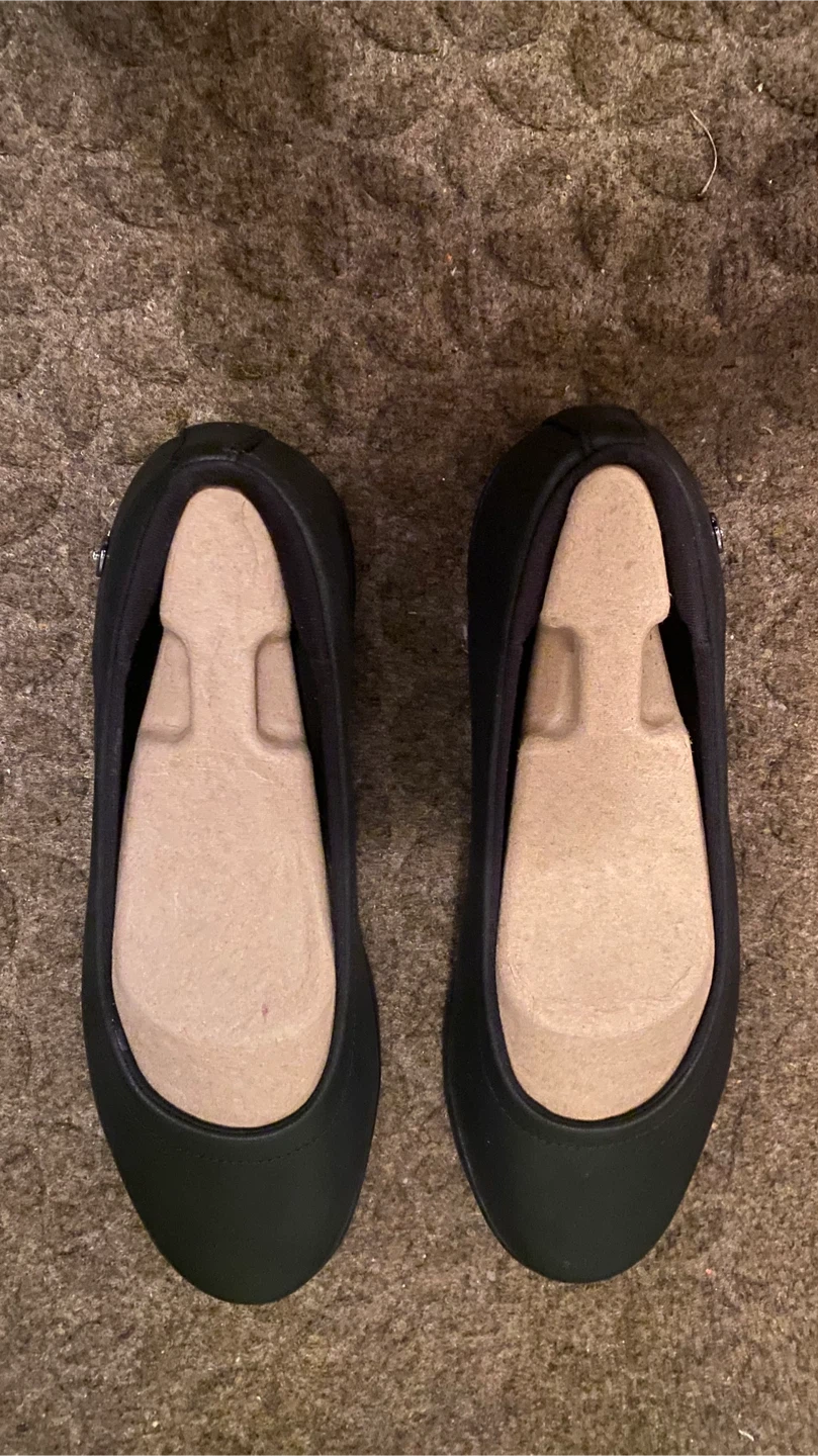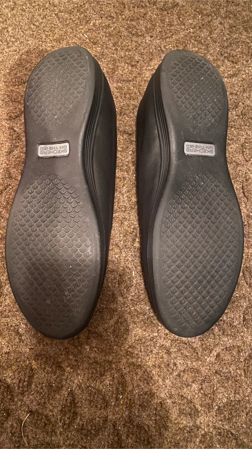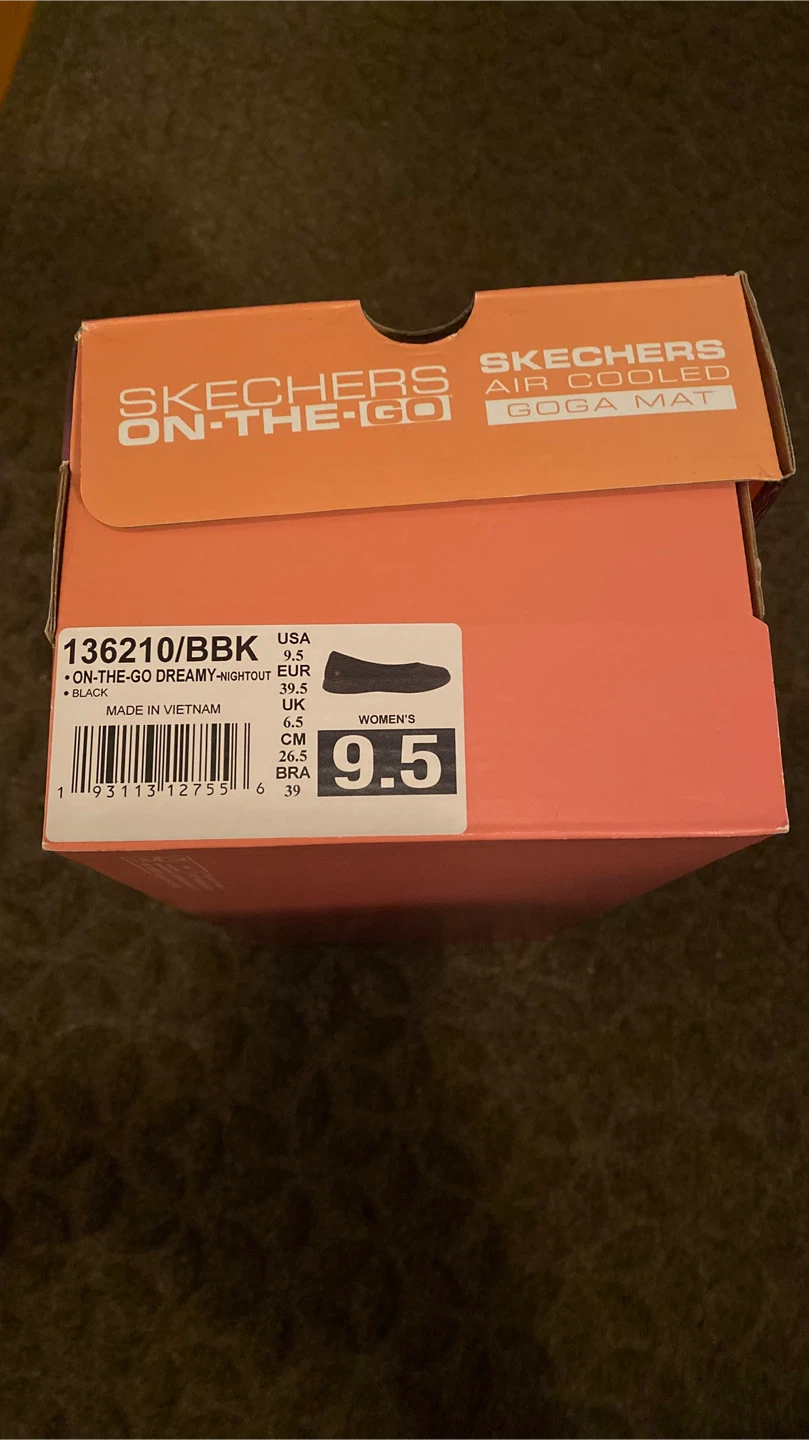 These are Skechers On-the-Go Dreamy Nightout ballet flats in black. They're a women's size 9.5. Air-Cooled Goga Mat insole. Made in Vietnam.