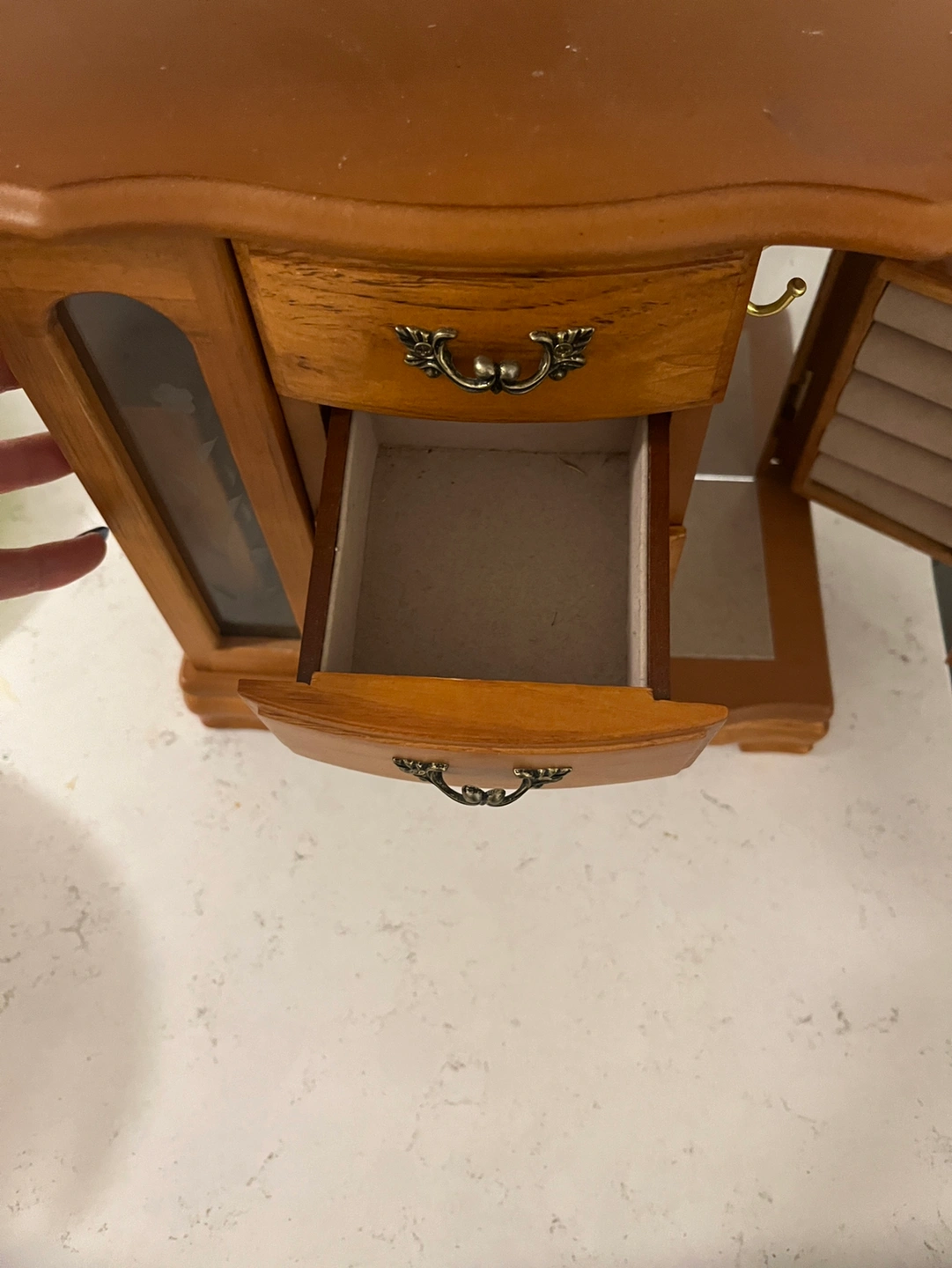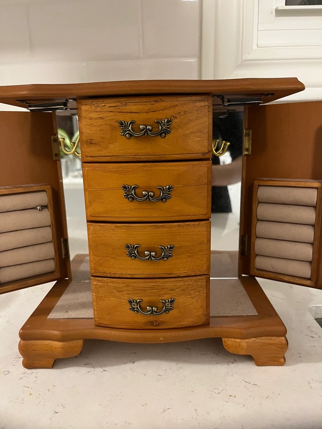 4 drawer compartments + 2 sections for rings and hanging necklaces
