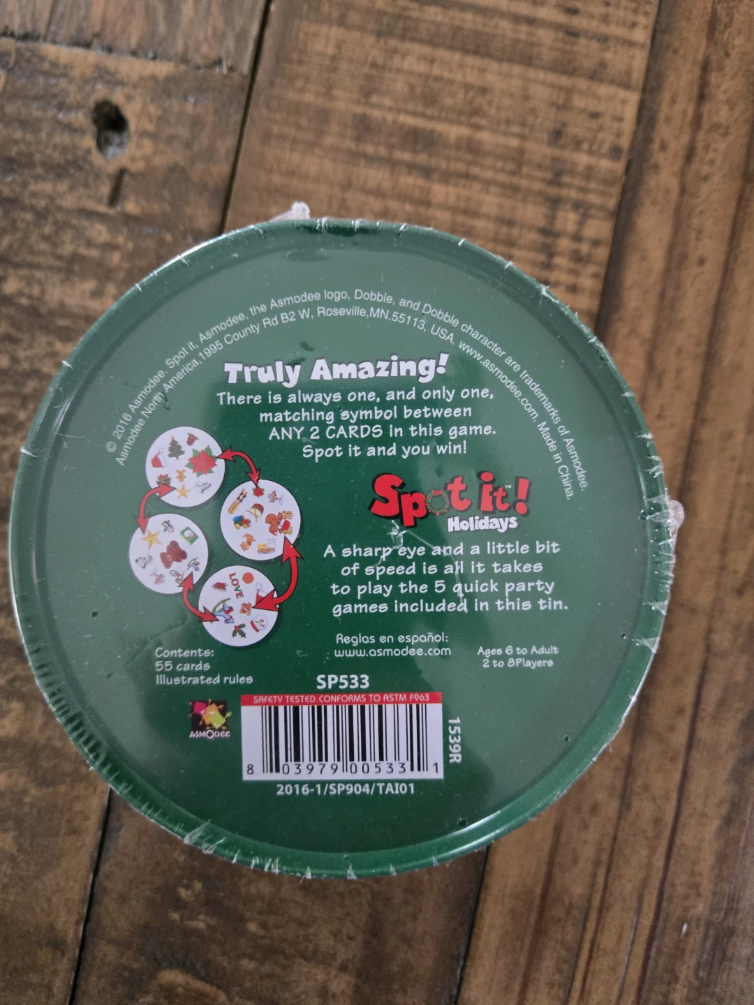 It's the Spot It! Holidays card game, perfect for family fun. This game includes 55 illustrated cards with a holiday theme. Ages 6 to adult, for 2 to 8 players.
