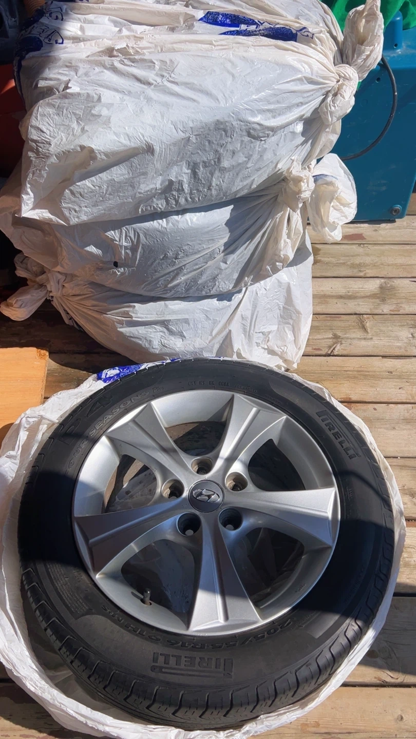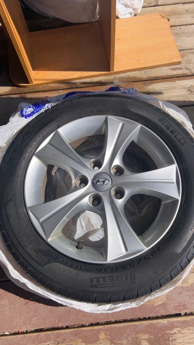 Pirelli Four Seasons tire mounted on a Hyundai alloy rim. Tire size is 205/55R16. It's a nice, reliable tire for various weather conditions. This would be a great spare tire or replacement for a Hyundai vehicle.