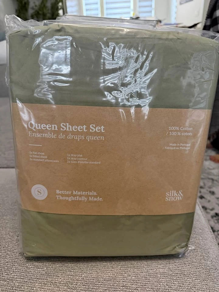 New Silk & Snow queen sheet set. 100% cotton, super soft. Comes with flat sheet, fitted sheet, and two standard pillowcases. Nice eucalyptus green color. Made in Portugal.