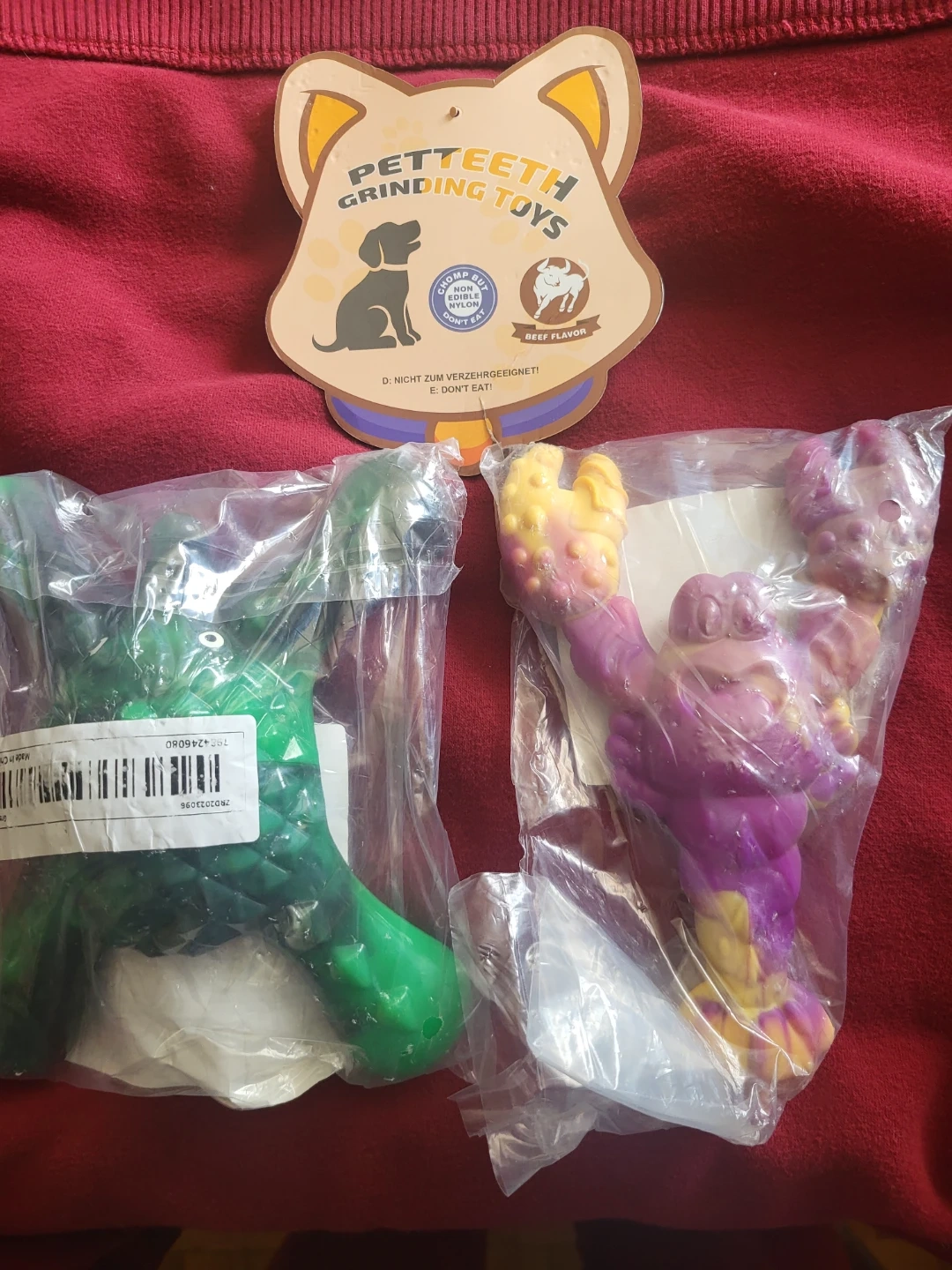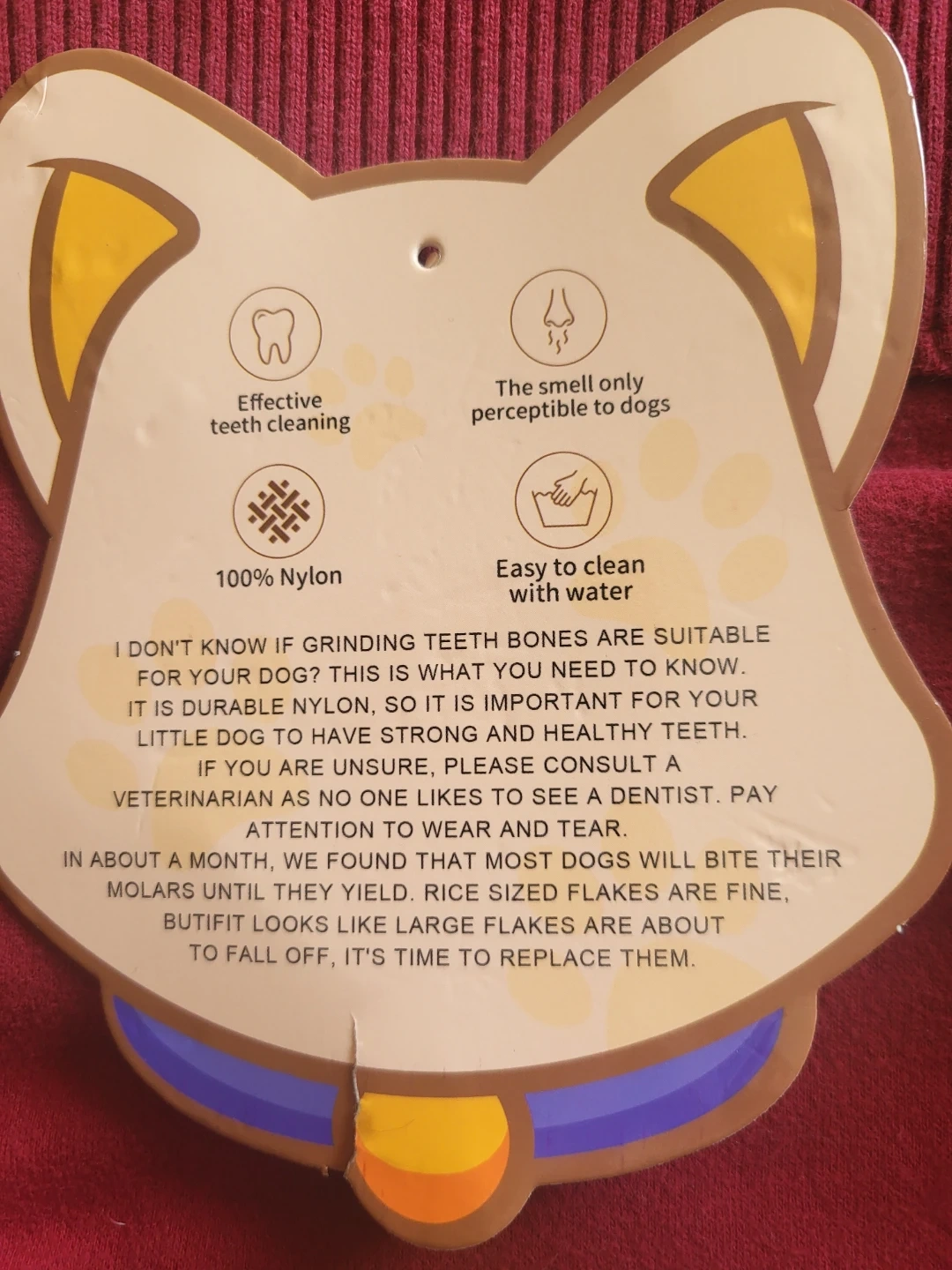 These dog grinding toys are made of 100% Nylon for effective teeth cleaning. They're easy to clean with water. These toys are designed for dogs to bite until they yield rice-sized flakes, indicating it's time for a replacement.