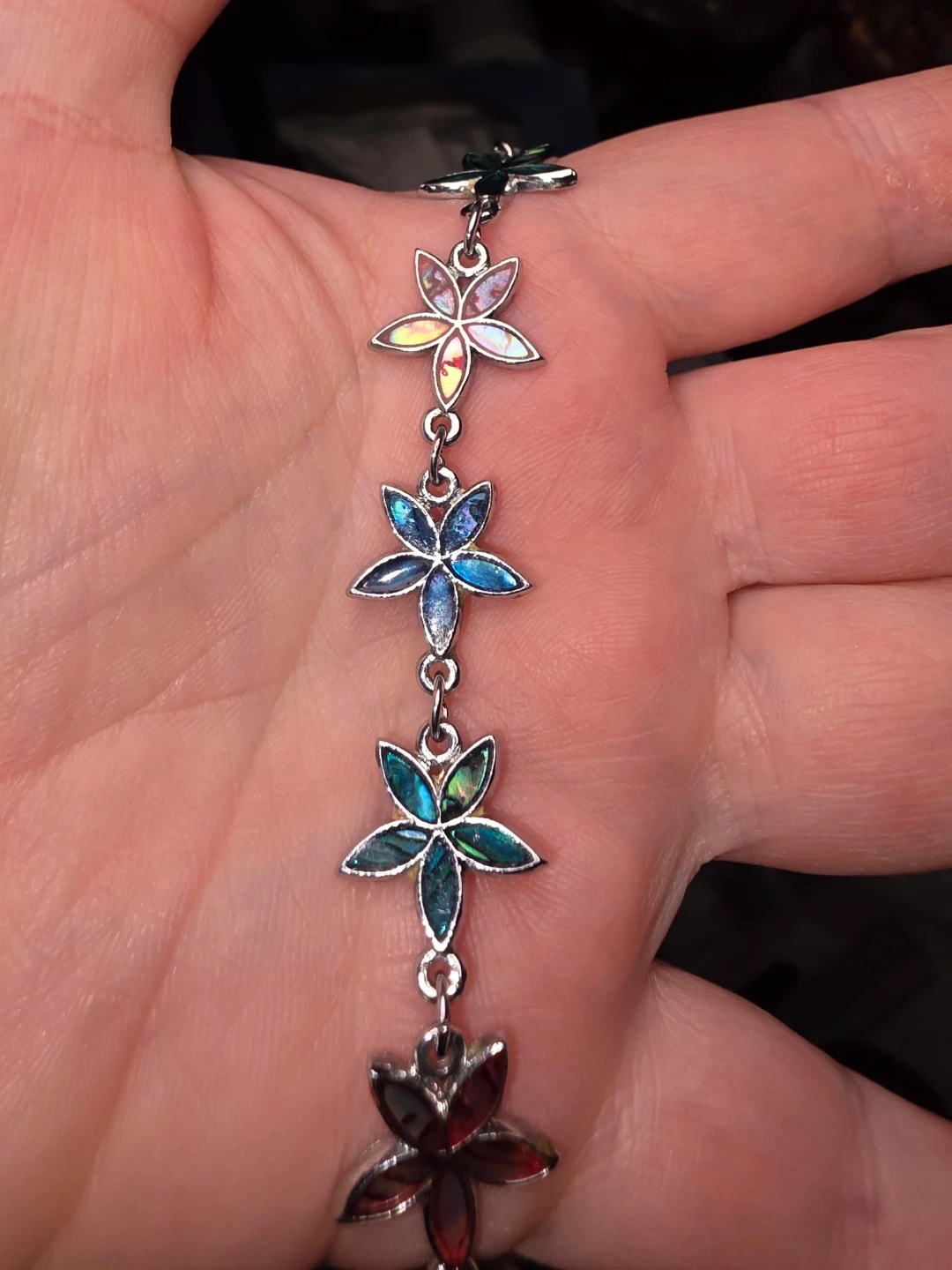 A pretty bracelet featuring multiple flower-shaped charms with iridescent inlays. The silver-tone chain has a lobster clasp closure. It's a lovely accessory for adding a pop of colour to any outfit!