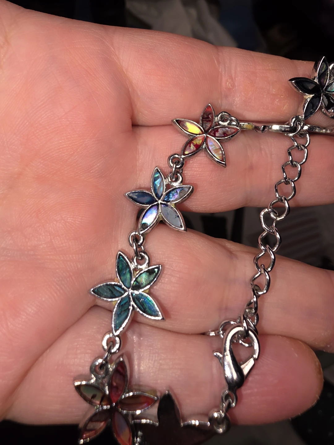A pretty bracelet featuring multiple flower-shaped charms with iridescent inlays. The silver-tone chain has a lobster clasp closure. It's a lovely accessory for adding a pop of colour to any outfit!