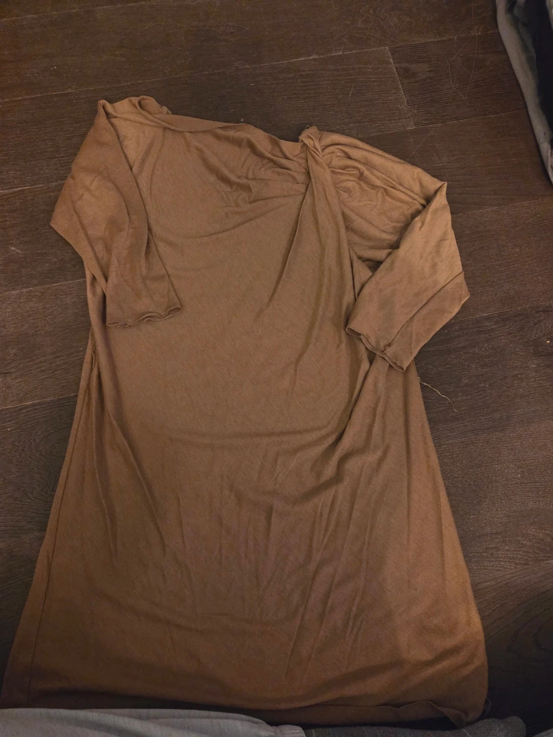 A soft brown tunic top with a unique one-shoulder design. It features a ruched detail on the shoulder and dolman sleeves. The material is lightweight and comfortable.