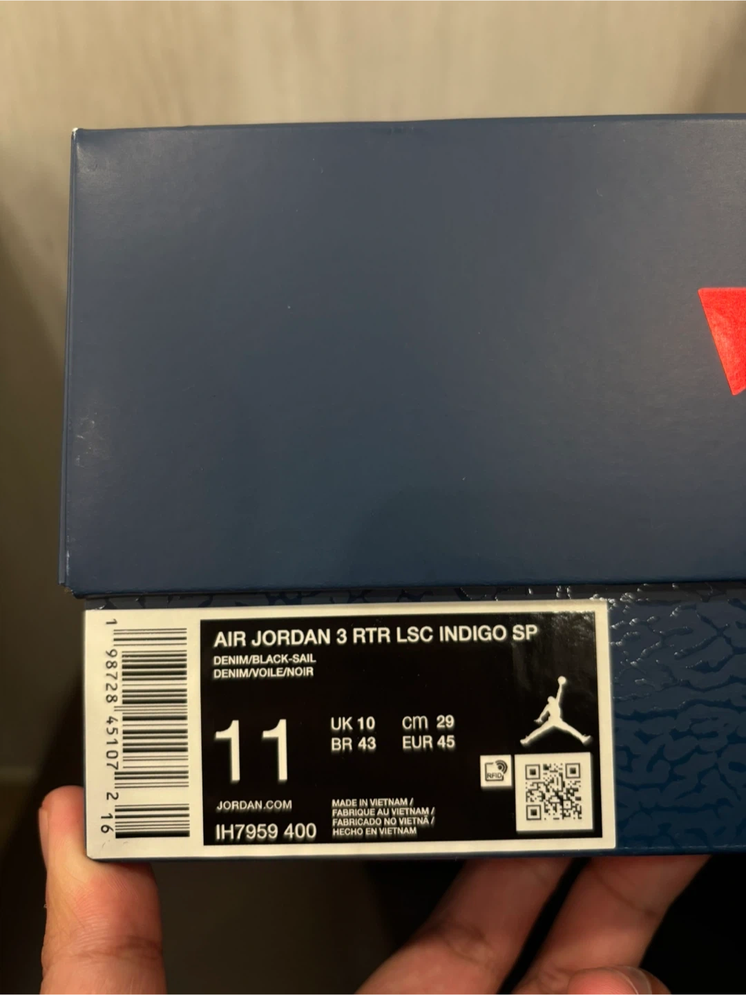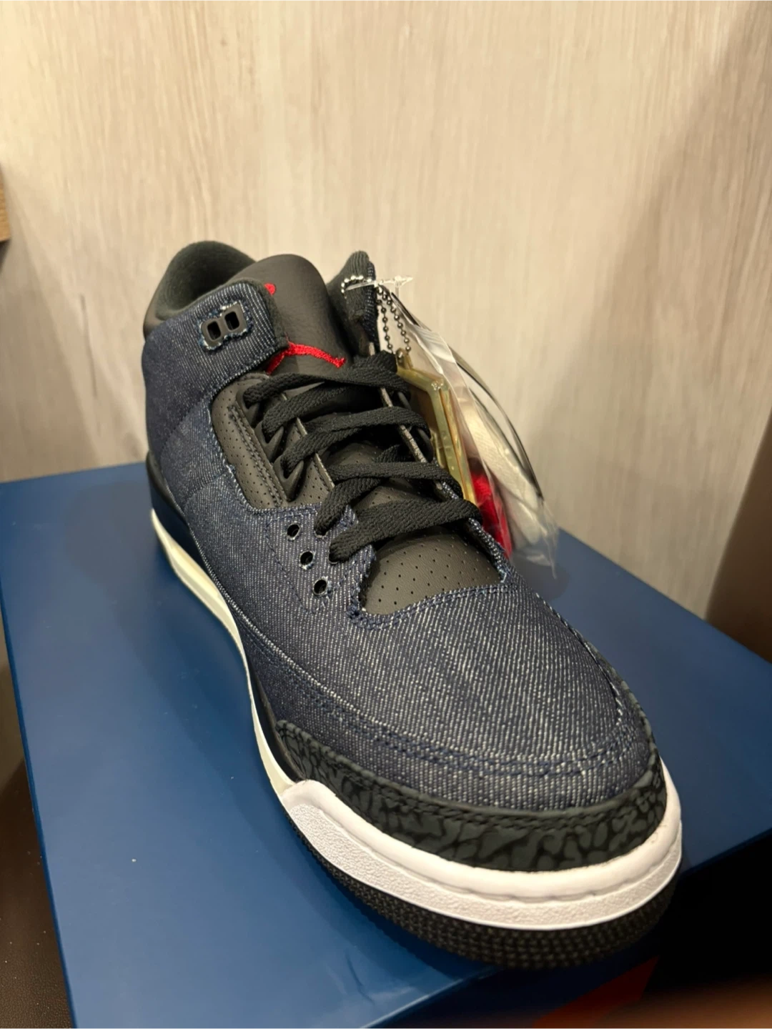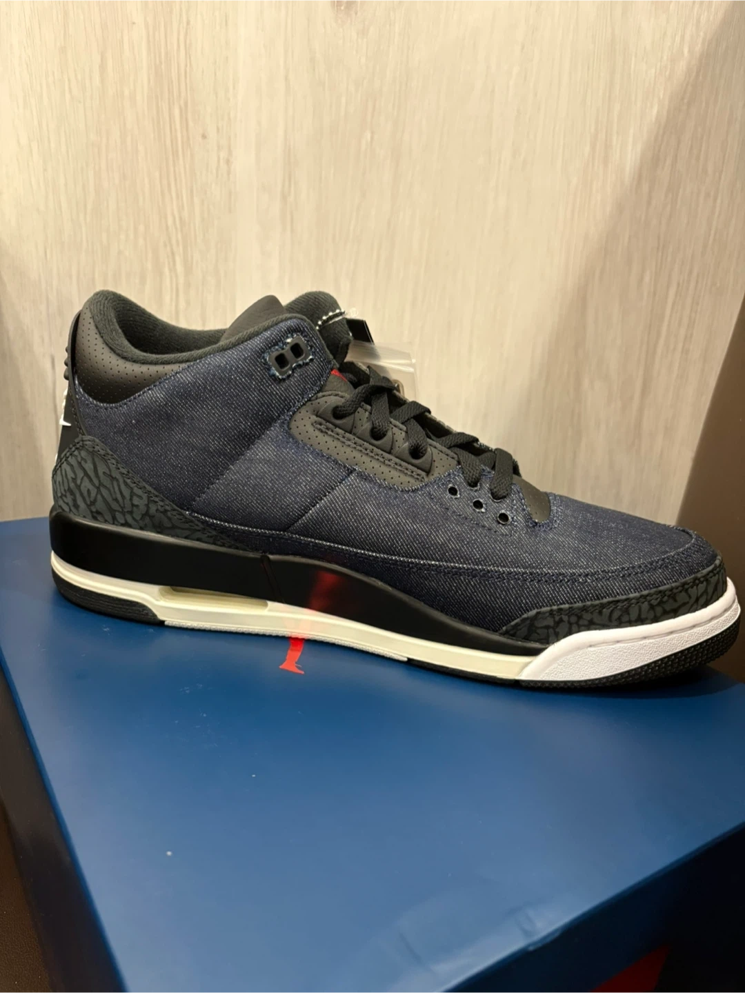 These Air Jordan 3 Retro SE shoes come in a denim and black colourway. They feature the iconic elephant print detailing. Includes original box and extra red laces.