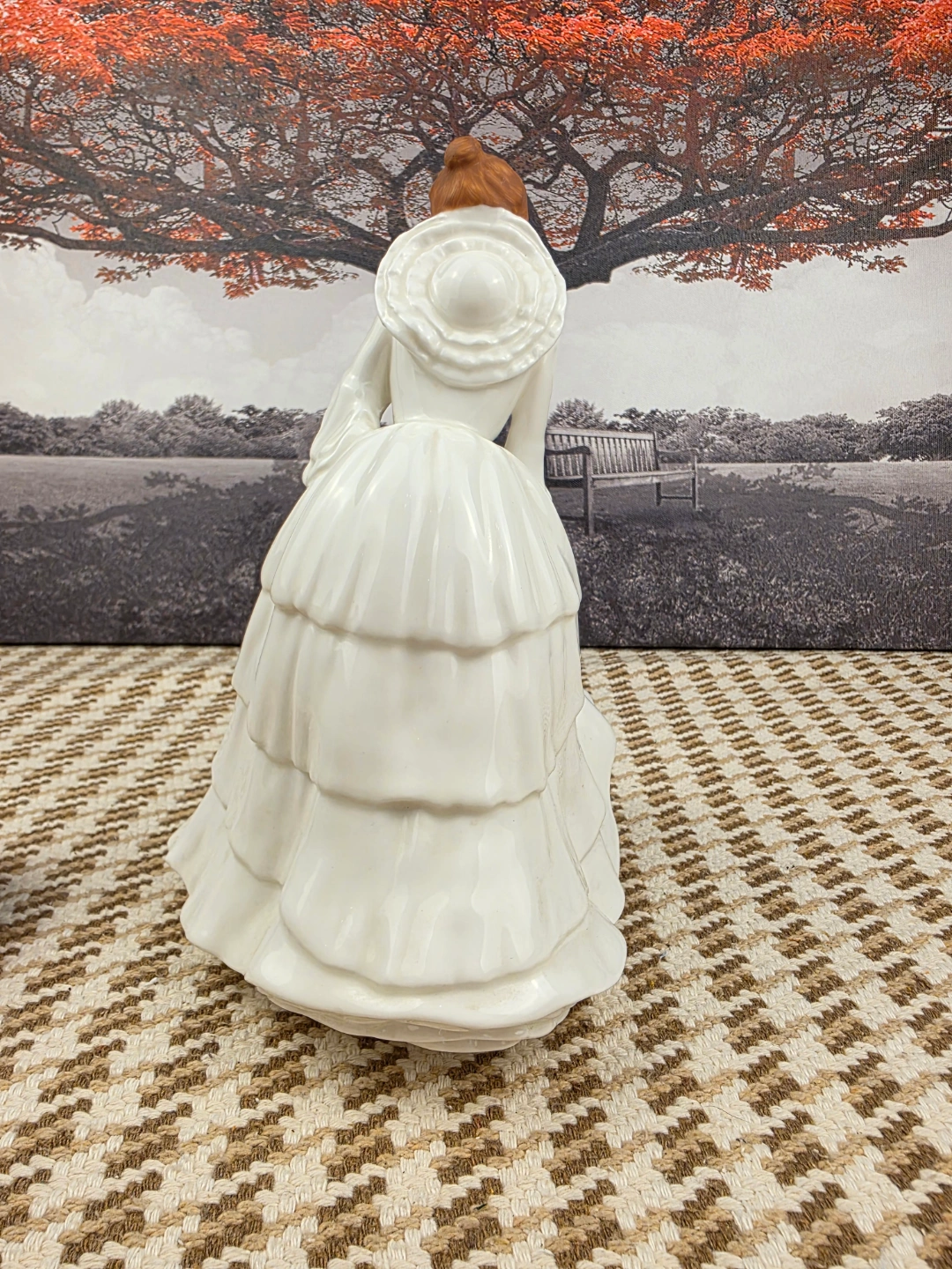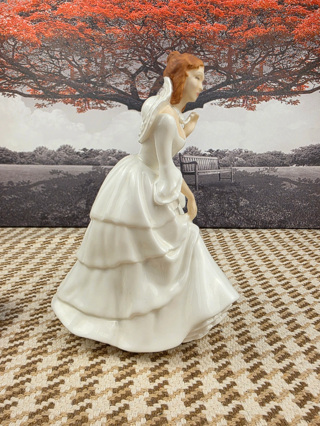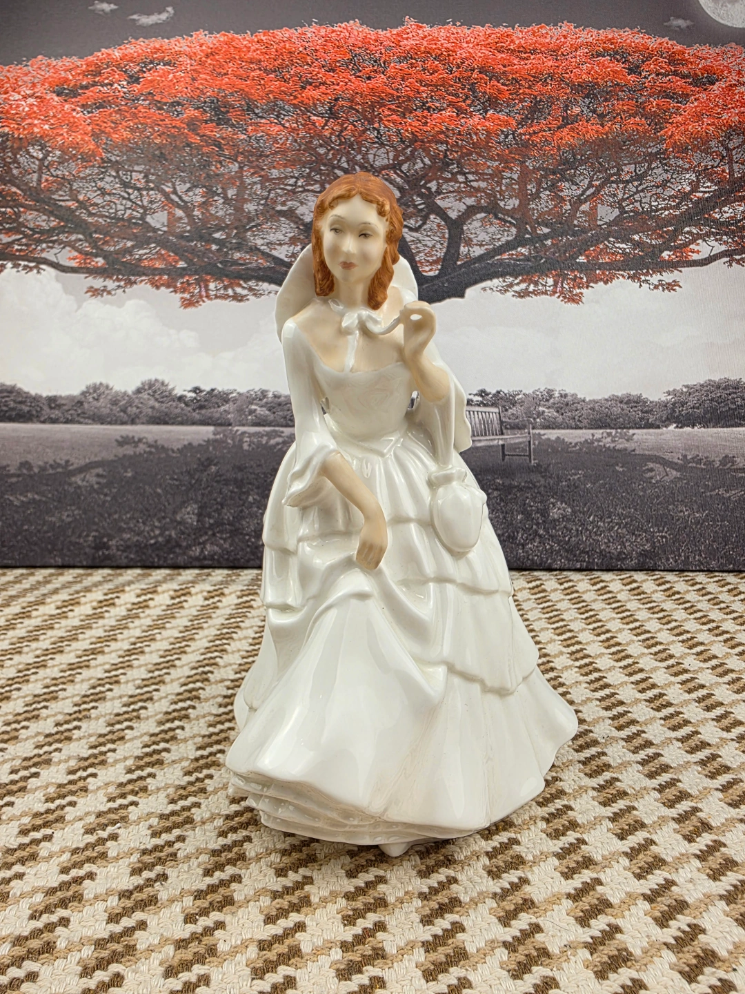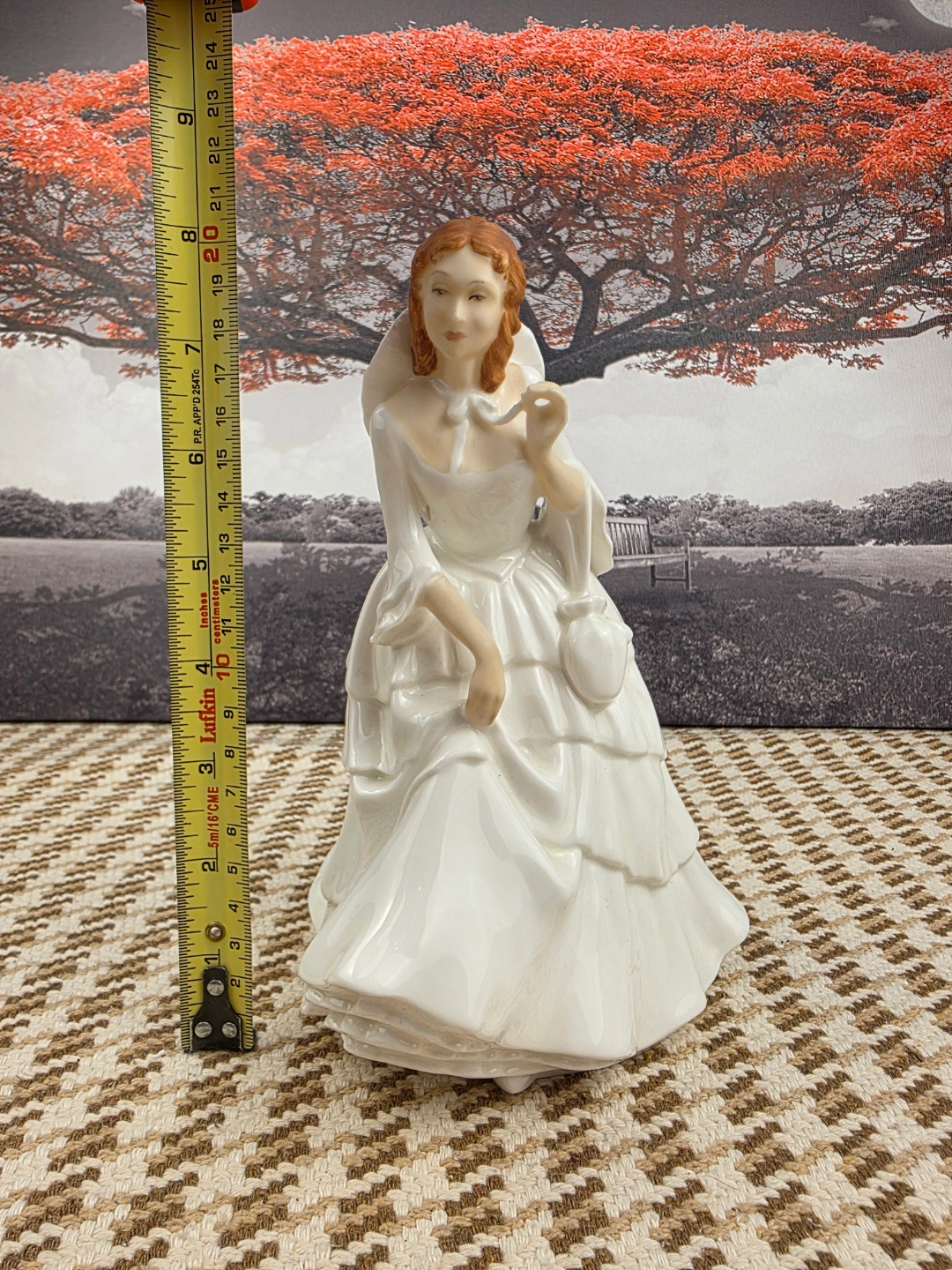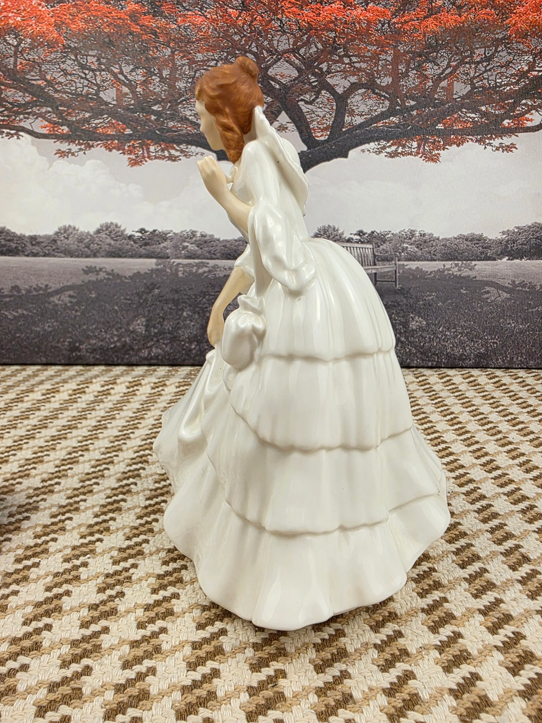 Beautiful porcelain figurine. Features a lady in a long white gown. Intricate detailing. Collectible item. Approximately 8 inches tall.