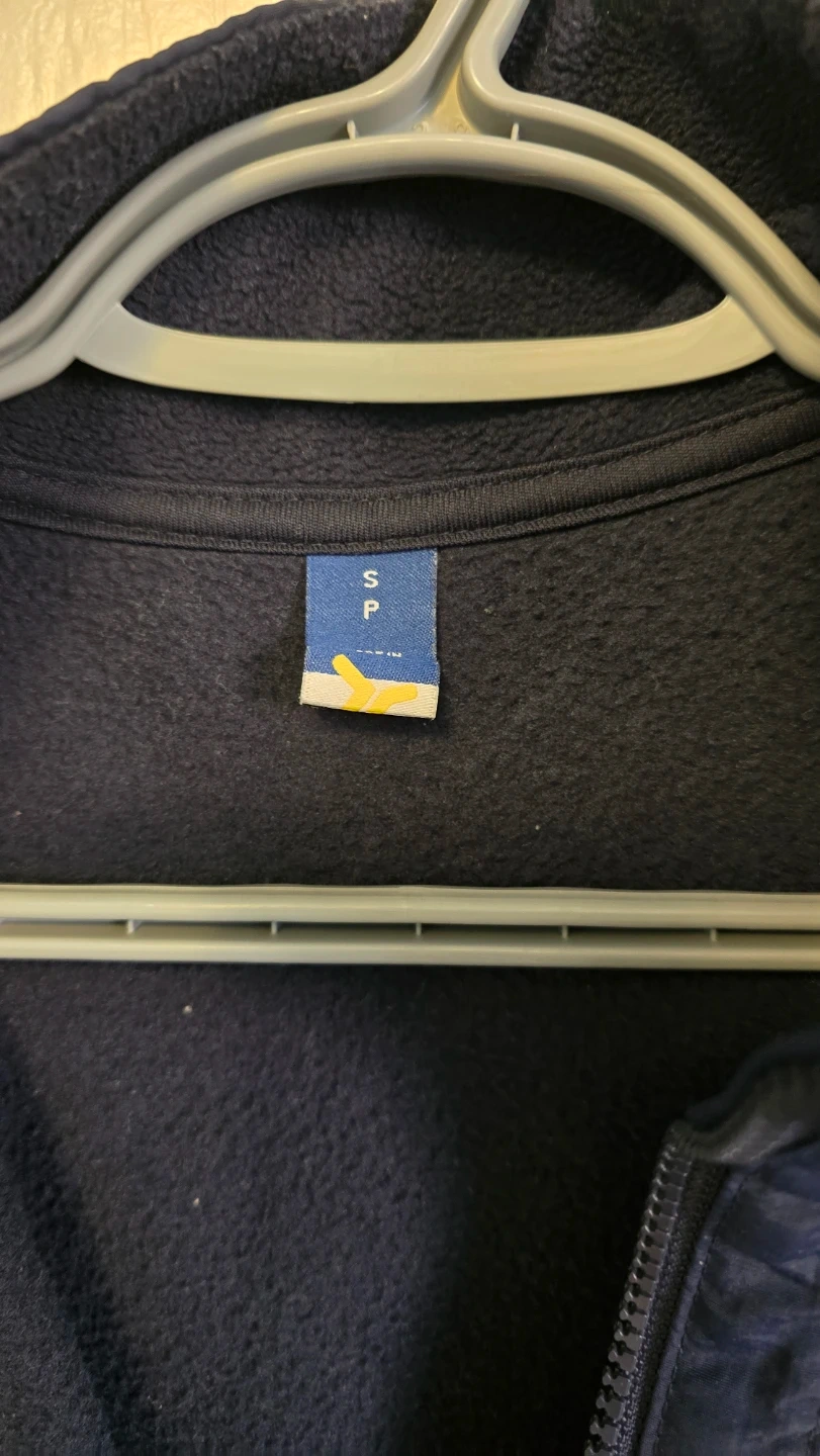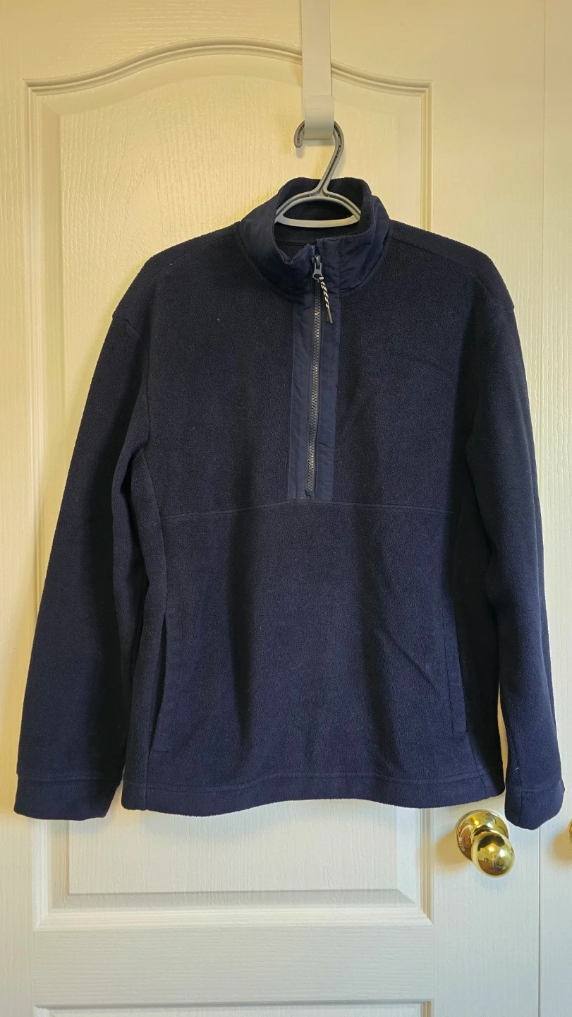 This is a navy blue fleece pullover sweater. It's a size small and features a quarter-zip closure. Two front hand pockets.