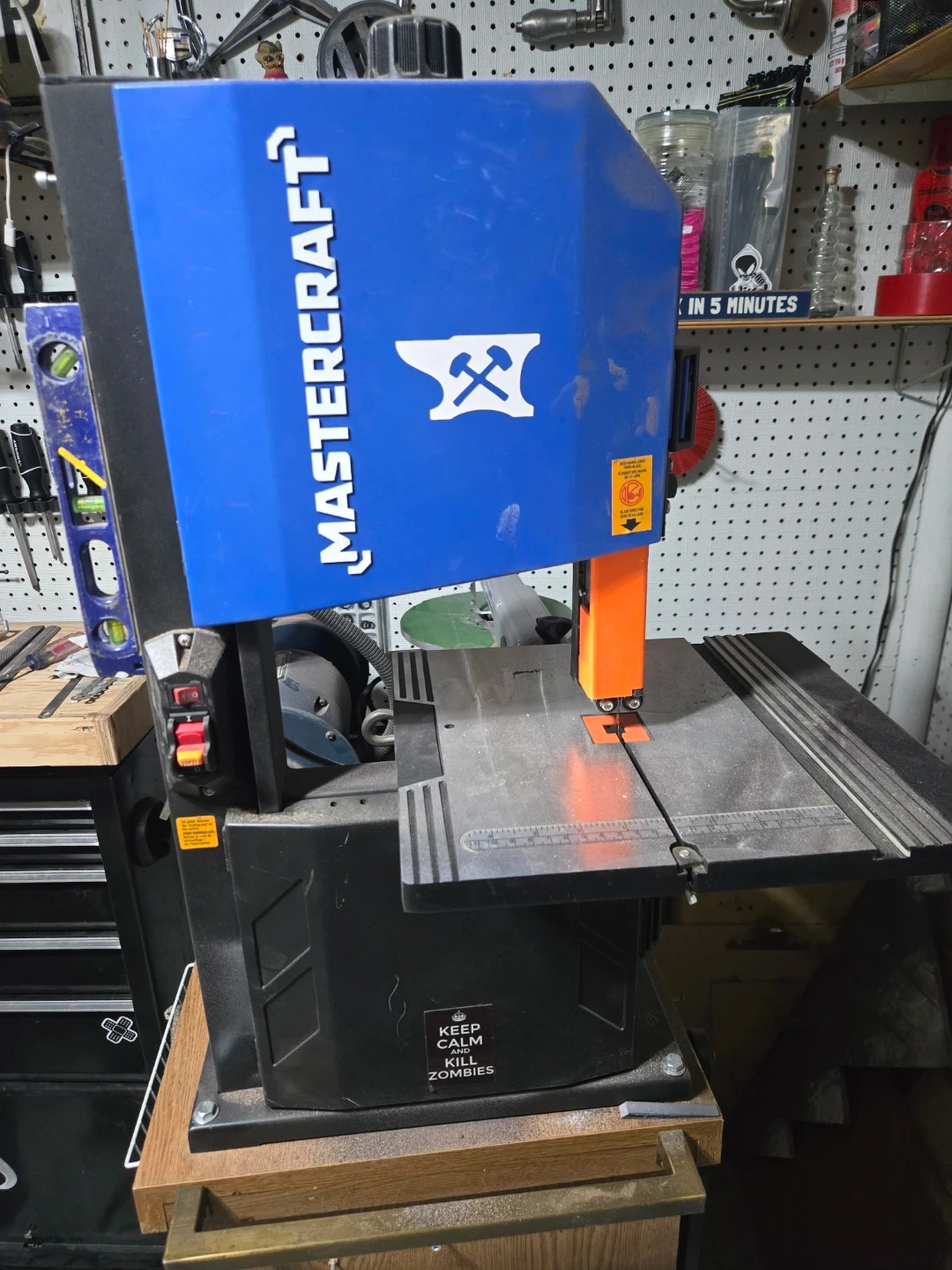 This is a Mastercraft bandsaw. It features a sturdy black base and a bright blue upper housing with the Mastercraft logo. The table has clear measurement markings for precise cuts. It's designed for workshop use.