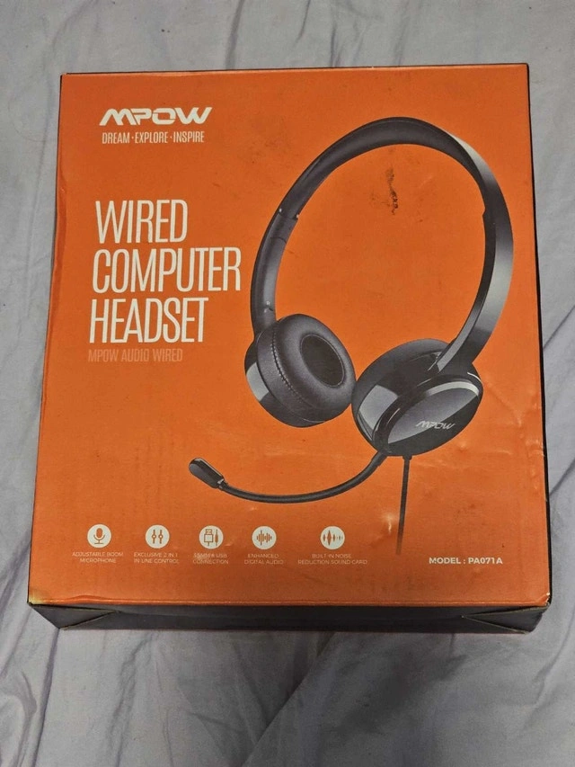 Experience clear communication with this Mpow wired computer headset, featuring a noise-cancelling microphone and in-line controls for easy adjustments. These are new and have never been opened. Key Features: * Adjustable boom microphone * Exclusive 2-in-1 in-line control * 3.5mm & USB connection * Enhanced digital audio * Built-in noise reduction sound card If the ad's still here, the headset is too, ready for its next adventure!