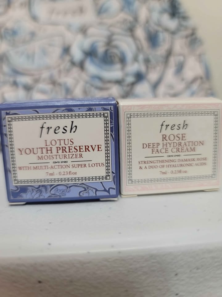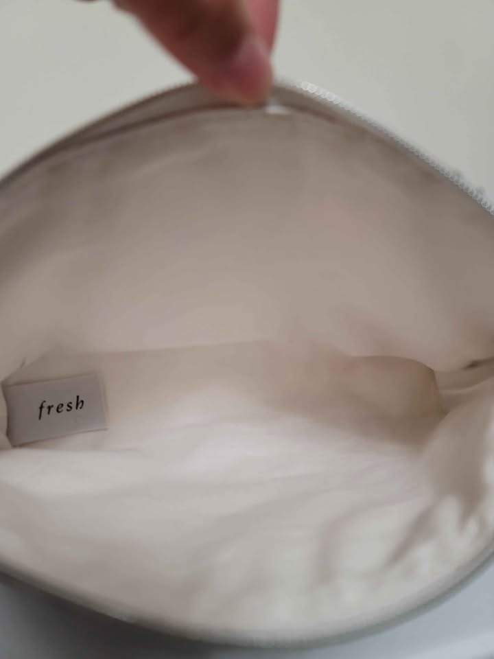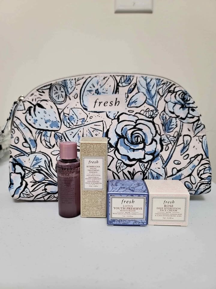 This is a set of new trial size products plus a large fabric cosmetic bag. Includes: