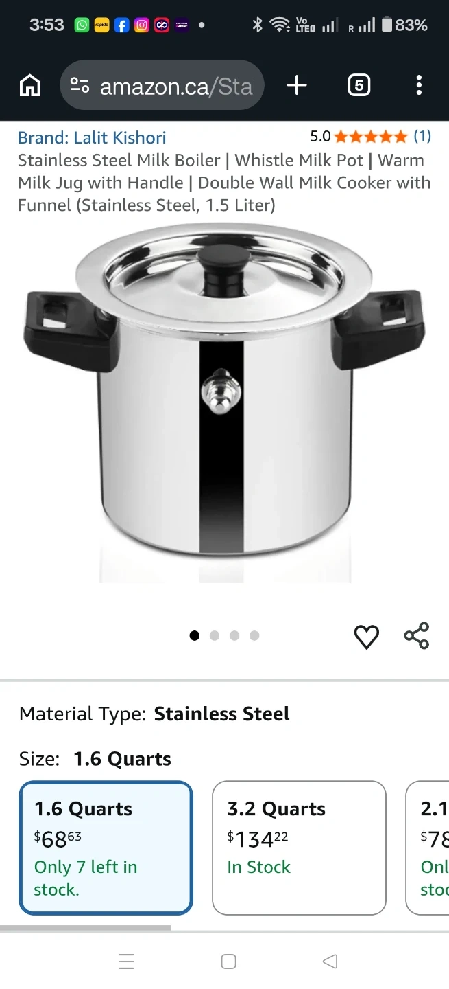 Buy & SellStainless Steel Milk Boiler Whistle Milk Pot 1.5 ltrStainless Steel Milk Boiler Whistle Milk Pot 1.5 ltr$15This is a stainless steel milk boiler. It's a 1.5 ltr capacity pot with a whistle and handle. Made from durable stainless steel.ConditionGoodWHERE TO MEETCheck LocationView MapSELLERverifiedMilindCity Center600 reviews1 chats·0 favorites·14 viewsSEND CHAT TO SELLERHi Milind! I’m interested in your listing.Hi Milind! I’m interested in your listing.Get the Karrot app to chatSign In to chat