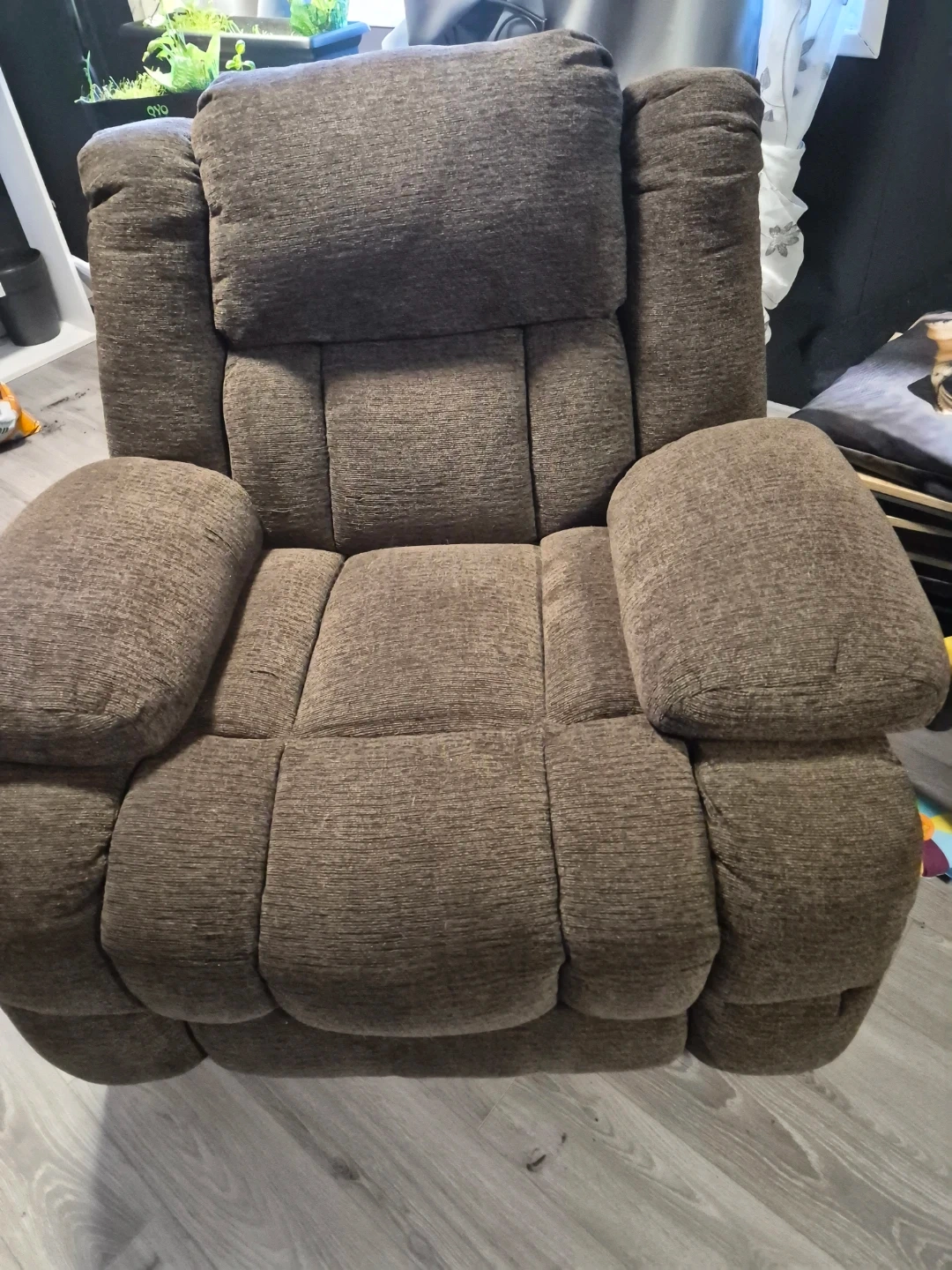 Comfortable brown recliner chair. Upholstered in a textured fabric. Features a manual reclining mechanism.